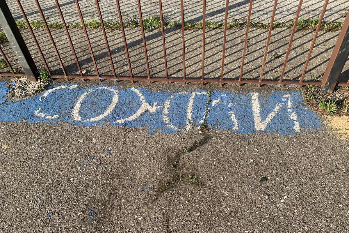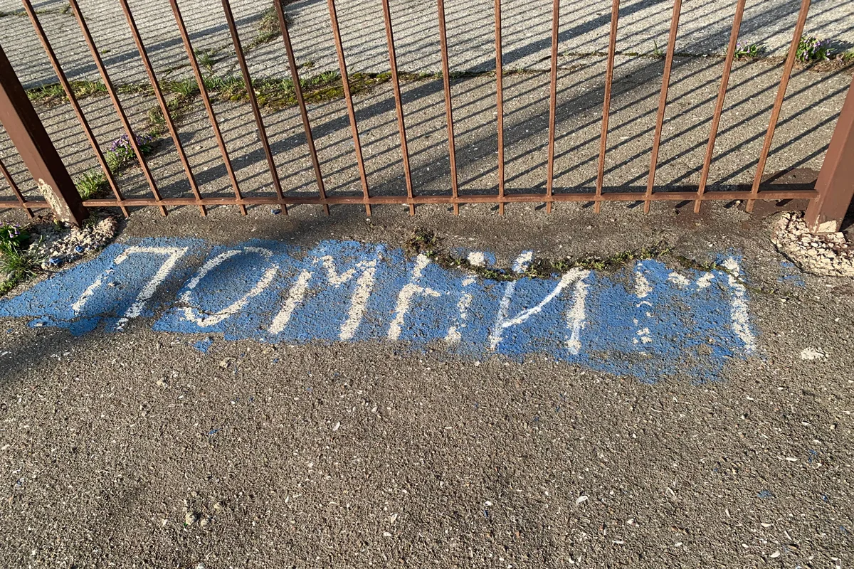 Внизу, на асфальте, замечаю полустертую надпись. Каждое слово — «сожгли», «одесситов», «помним» — в отдельном прямоугольнике, выцветшем, синем или желтом: ненавязчивый намек.