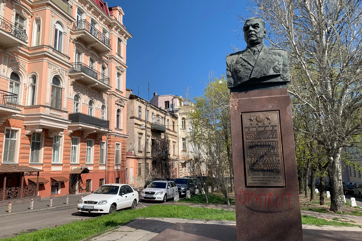Выручает совет «ориентироваться на Малиновского». Постамент с бюстом советского маршала отмечен буквой «Z» и красной надписью на украинском: «Окупант». Здание факультета старинное, каждый российский удар с воздуха поблизости добавляет ему трещин. Ищу профессора Елену Александровну Радзиховскую.