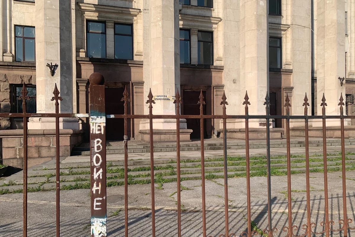 Дом профсоюзов до сих пор необитаем, окружен по периметру оградой. Часть окон затянута пленкой. В бытность Михаила Саакашвили главой Одесской облгосадминистрации собирались (он сам об этом заявлял!) разместить в здании штаб ВМС. Существовали и другие планы, но не реализовалось ничего. У входа в Дом профсоюзов видна полоска объявления: «Аренда помещений, тел…» А на железе ограждения четко белеет «Нет войне».