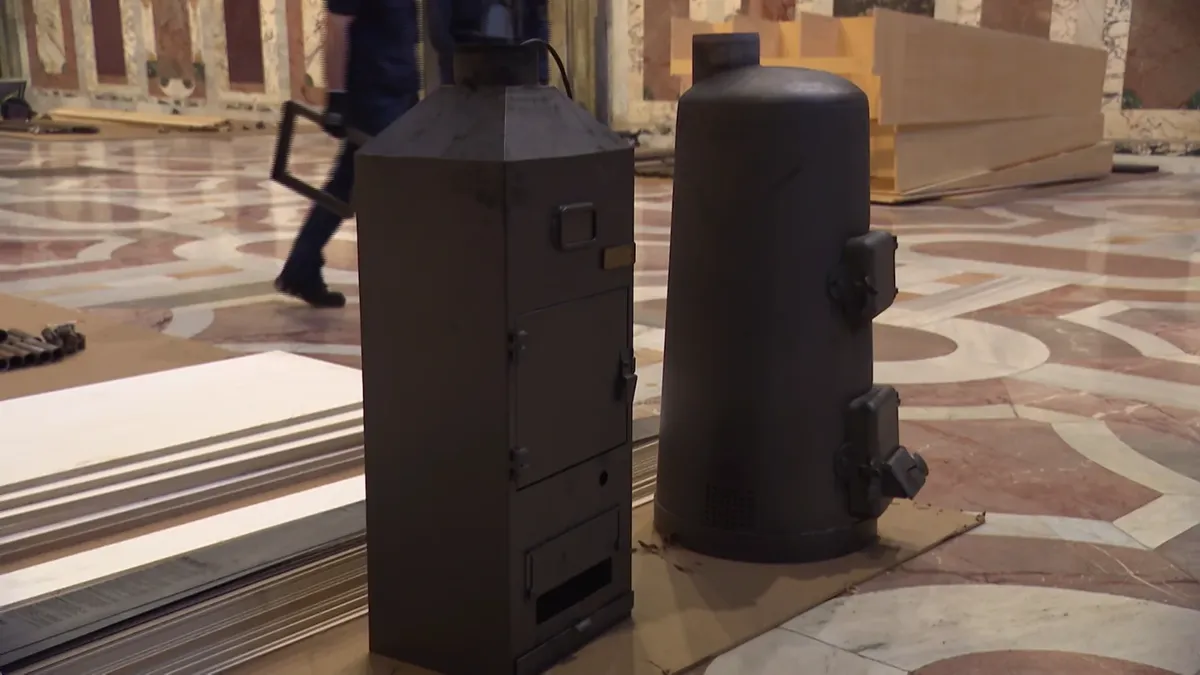Другие устанавливают в углу капеллы ту самую печь, которая будет выдавать дым, сигнализирующий о результатах голосования.