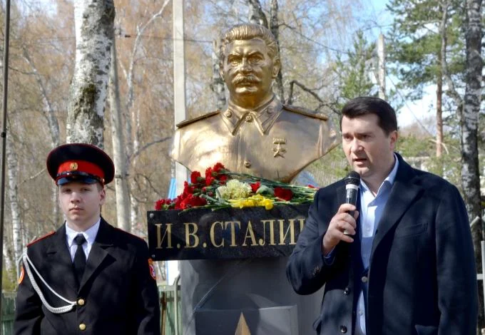 The first new monument to Stalin in the region was erected in December at a house where the dictator had lived which has since been turned into a museum. Vologda region Governor Georgy Filimonov, whose office features a painting of an imaginary scene of Stalin shaking his hand, said that the monument had been put up due to public demand.