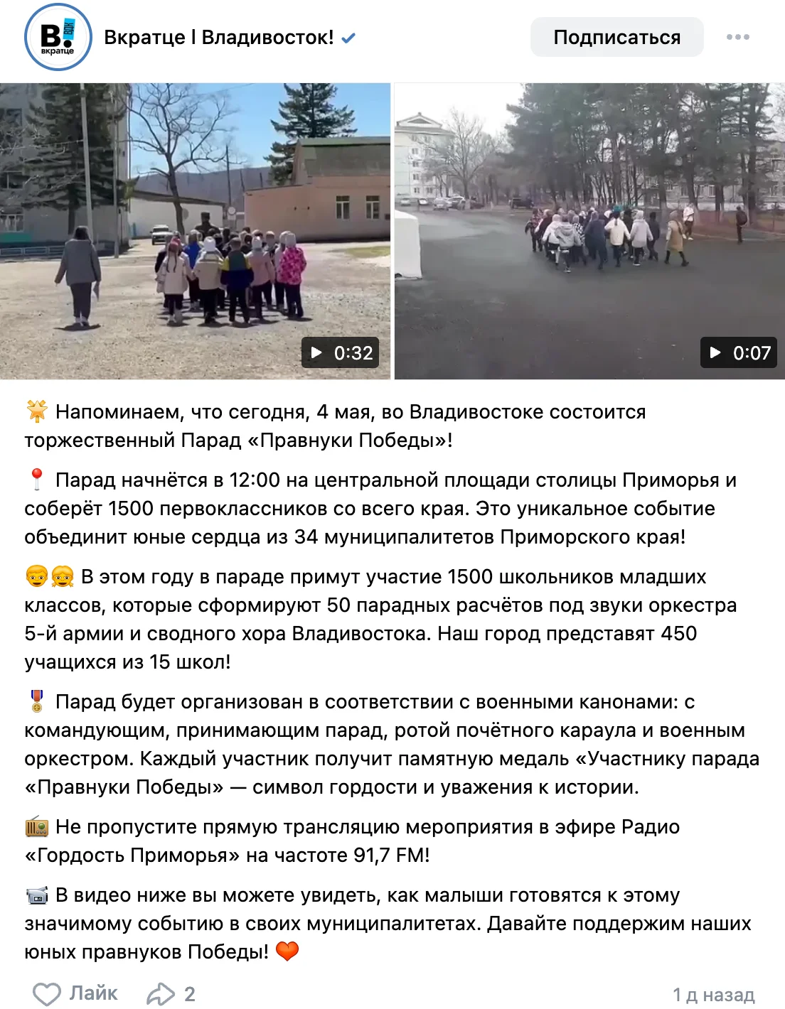 4 мая во Владивостоке прошел парад «Правнуки Победы», в котором поучаствовали более 1500 учеников начальных классов со всего Приморья. Вместе с ними в колоннах шли действующие и бывшие военные, а на трибунах за происходящим наблюдали школьники из КНДР. Подготовка заняла несколько месяцев: детей несколько раз возили на репетиции, оплачивали им автобусы и костюмы.
