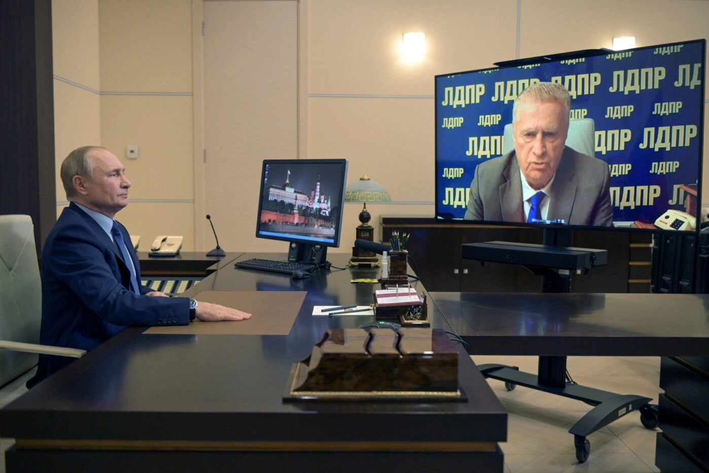 Владимир Путин во время видео-встречи с Владимиром Жириновским в Ново-Огарево под Москвой 5 октября 2021 года. Фото: Sputnik/Alexei Druzhinin/Kremlin via Reuters.