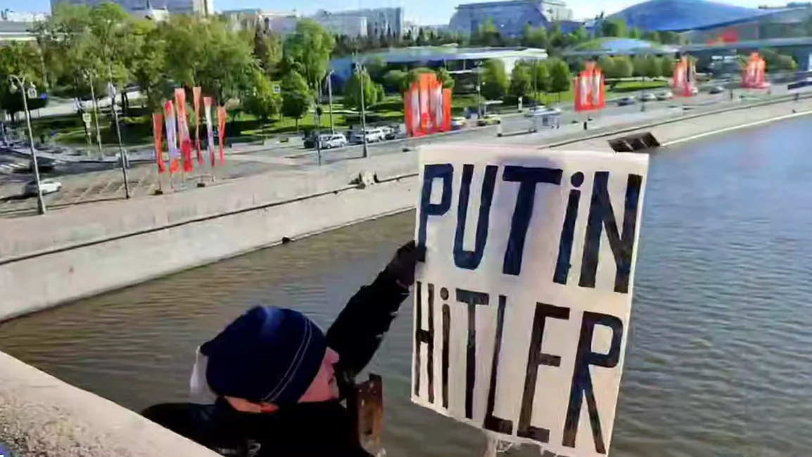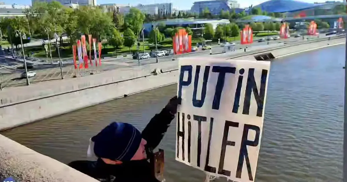 A 68-year-old activist has climbed over the side of a bridge on the Moskva River in the centre of the Russian capital carrying a sign saying “Putin Hitler”, independent news channel SOTAvision reported on Tuesday.