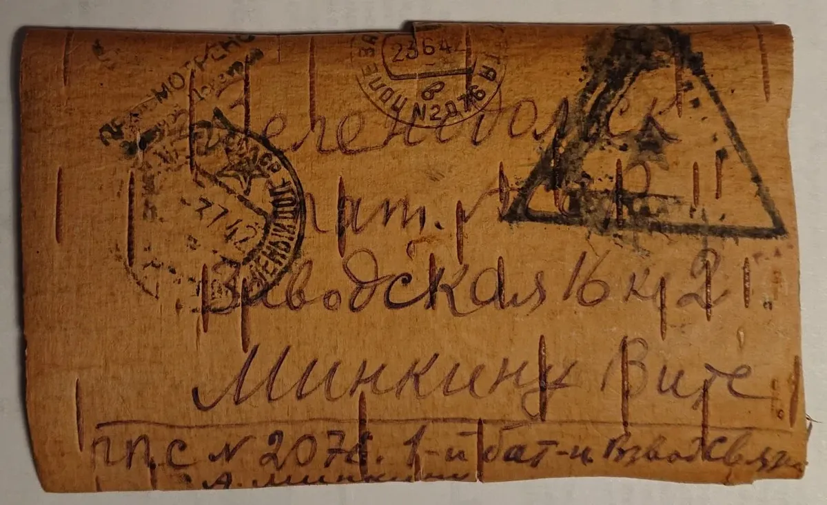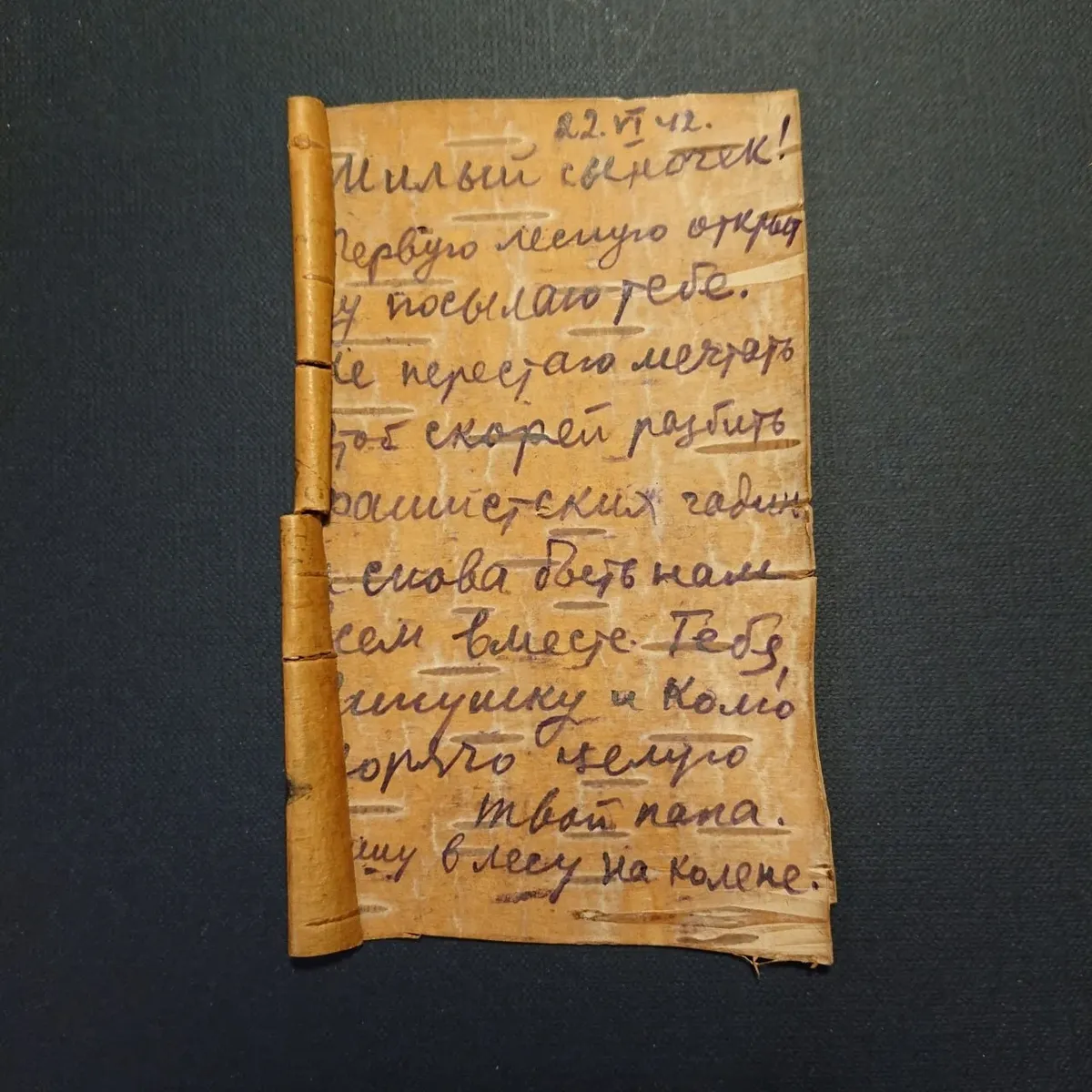 «22 июня 1942. Милый сыночек!.. Не перестаю мечтать, чтобы скорее разбить фашистских гадин и снова быть нам всем вместе…» Открытку эту мой дед моему отцу с фронта прислал, на куске бересты написал, музеи просят, я не отдаю.