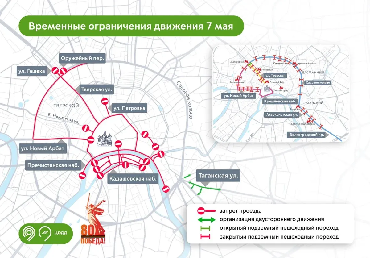На участке Волгоградского проспекта, Марксистской улице, северной части Садового кольца, Тверской улице, улицах Петровка и Новый Арбат перекроют дороги, станции метро временно перестанут работать на выход.