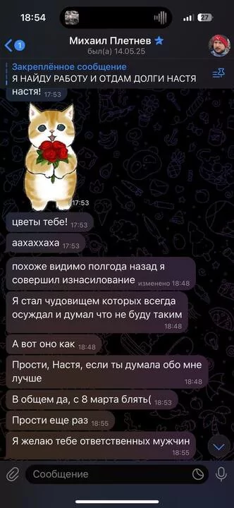 По ее словам, 8 марта 2025 года Плетнев прислал ей несколько сообщений в телеграме. В одном он поздравил ее с праздником, а в следующих написал: «Похоже, видимо, полгода назад я совершил изнасилование»; «Я стал чудовищем, которых всегда осуждал и думал, что не буду таким» (скриншоты этих сообщений есть у «Холода»). Потом он попросил у нее прощения.