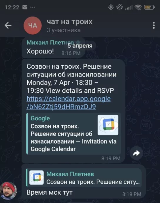 Вскоре, по словам Альи и Анастасии, активист через гугл-календарь пригласил их на созвон под названием «Решение ситуации об изнасиловании». «То есть он решил, что это задачка в гугл-календаре. Для меня это просто поразительный цинизм», — говорит Анастасия. Она прислала редакции скриншот с этим созвоном, запланированным в календаре.