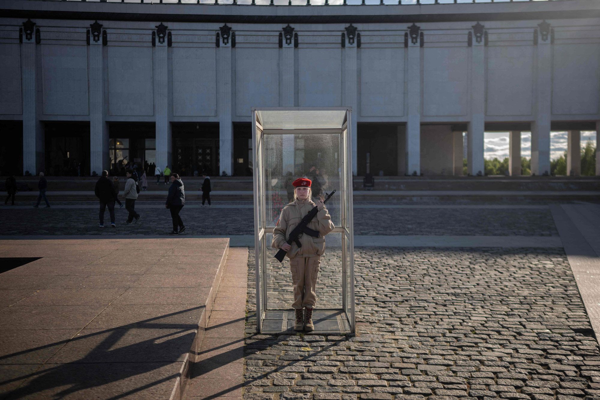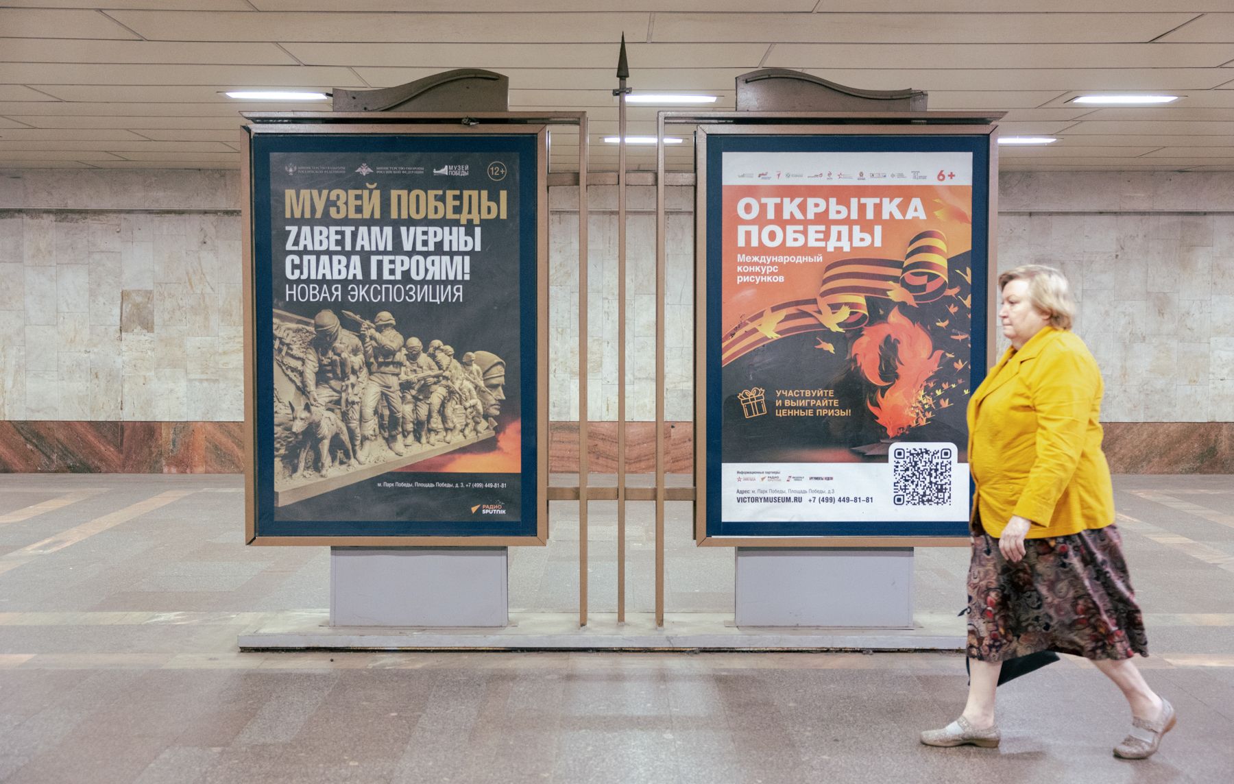 У одной из станций метро неподалеку от Третьего транспортного кольца толпятся несколько десятков подростков и руководящие ими учительницы. К одежде всех подростков приколоты георгиевские ленты, в руках — красные воздушные шары. У турникетов москвичей сегодня встречает голос Сергея Собянина. Мэр поздравляет ветеранов и других жителей города с праздником и, явно намекая на российское полномасштабное вторжение в Украину, но не называя его напрямую, заявляет, что «сегодня Россия вновь сражается за свободу, добро и справедливость».