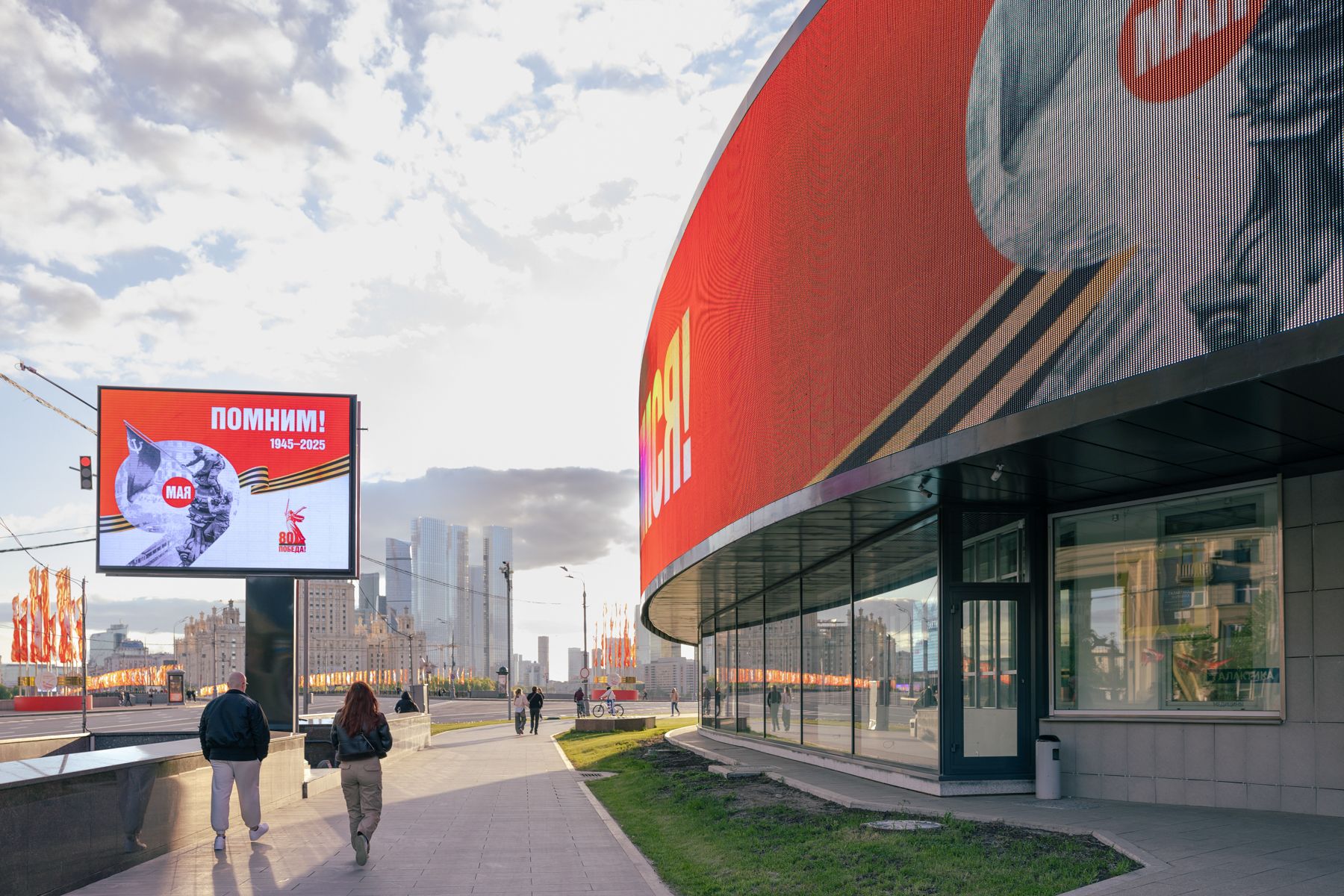Утром 9 мая Москва окончательно утонула в государственной символике, разработанной для празднования 80-летия Победы. Стилизованные изображения памятника «Родина-мать зовет», георгиевские ленты и фотографии советских солдат, появившиеся на улицах в начале мая, к старту Парада Победы стали украшать не только витрины продуктовых и аптек, но и заставки банкоматов. Цифровые билборды в этот день остановили показ рекламы: вместо крутившихся роликов с товарами Wildberries на них замерли черно-белый портрет фронтовика и надпись «Гордимся победой! 1945–2025». В последний раз такое случалось в марте 2024-го — тогда в память о погибших в теракте в «Крокус Сити Холле» вместо рекламы на билбордах Москвы появилась фотография свечи с текстом «Скорбим».