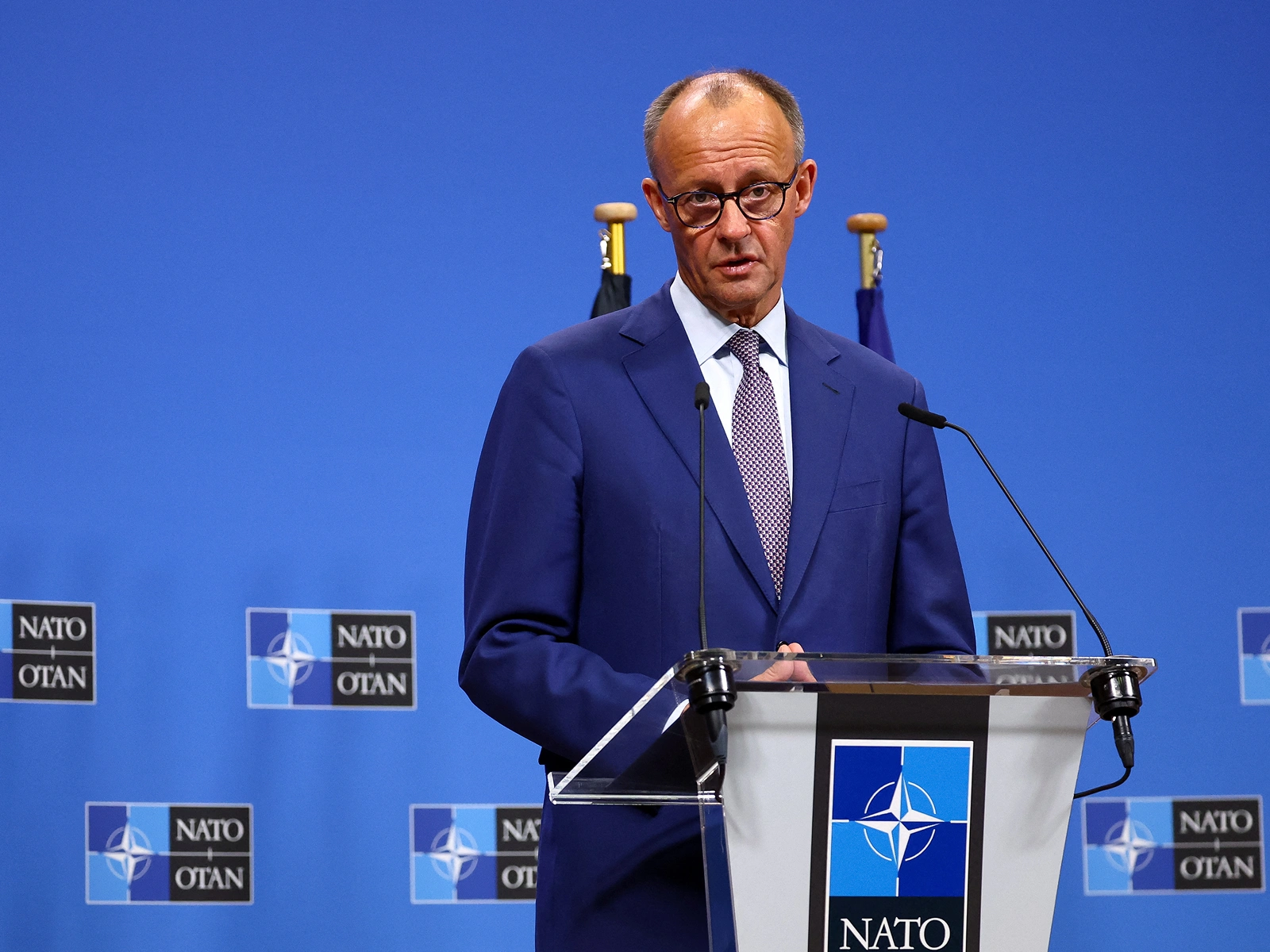 Фото: Канцлер Германии Фридрих Мерц общается с прессой в штаб-квартире НАТО в Брюсселе, 9 мая 2025 года. REUTERS/Piroschka van de Wouw