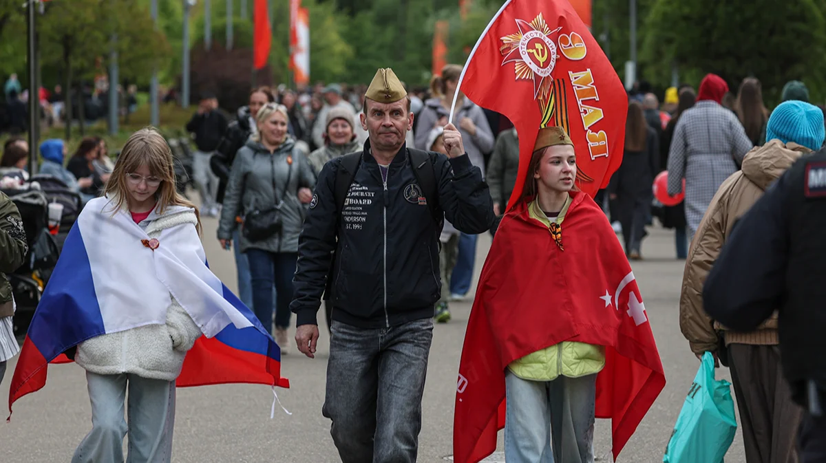 Люди с флагами идут по центру Москвы, Россия, 9 мая 2025 года. Фото: Фото: Максим Шипенков / EPA-EFE