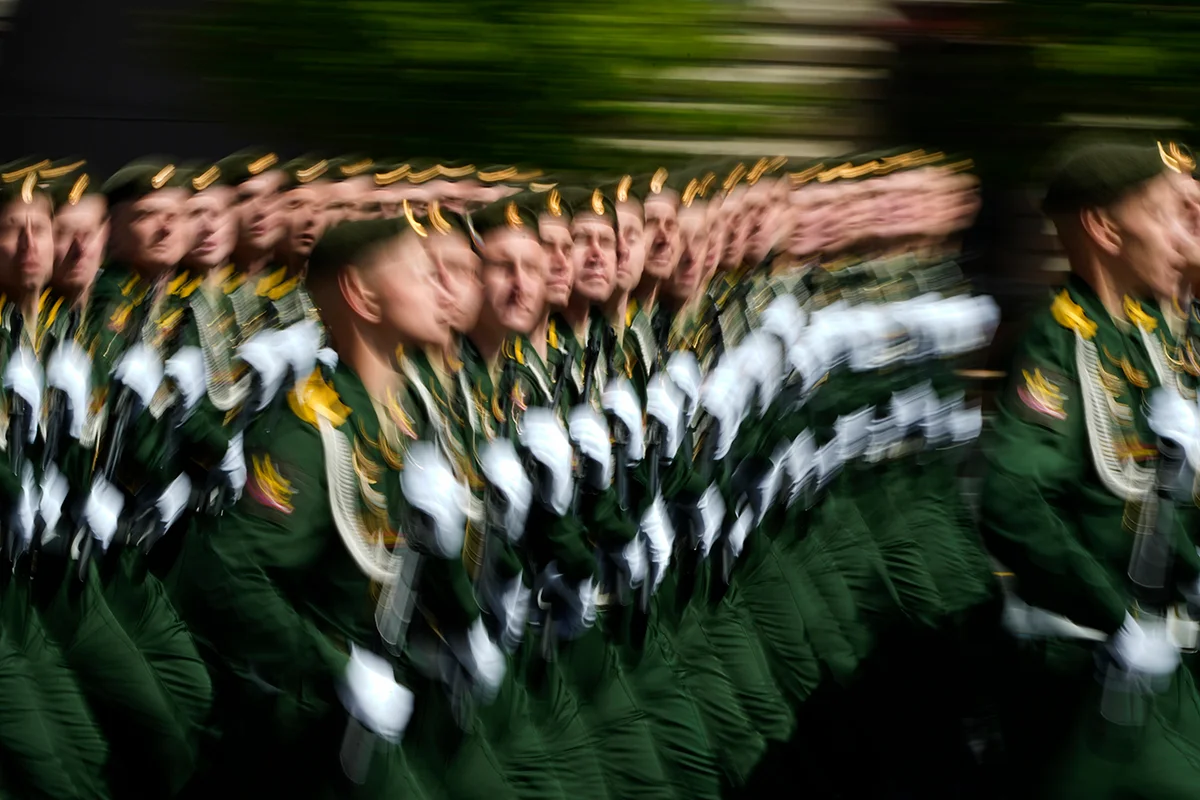 Выхожу из поезда на «Парке Победы». На эскалаторе много людей в пилотках, военной форме или просто с георгиевской ленточкой. В углу вестибюля, перед экраном, где обычно крутят рекламу мэрии Москвы, вижу небольшую толпу. Сегодня тут без звука транслируют парад с Красной площади: по брусчатке катятся танки.