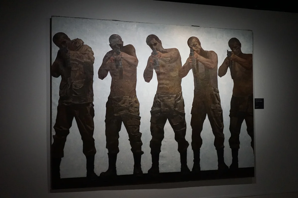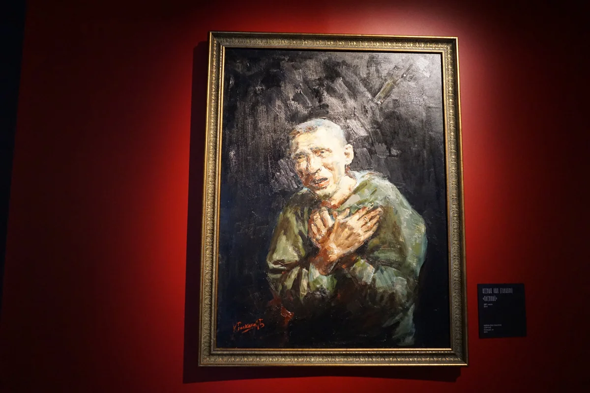 Рядом — ее же картины «Пленный» (2015), «Атланты» (2023), «Горловская мадонна» (2023), а также «Царь горы» (2025) Николая Кладницкого и «Расстрельная команда» (2016) Дмитрия Колистратова. Интересное название у холста Ольги Бордей, на котором маслом запечатлено плетение маскировочных сетей, — «Тревожность» (2024).