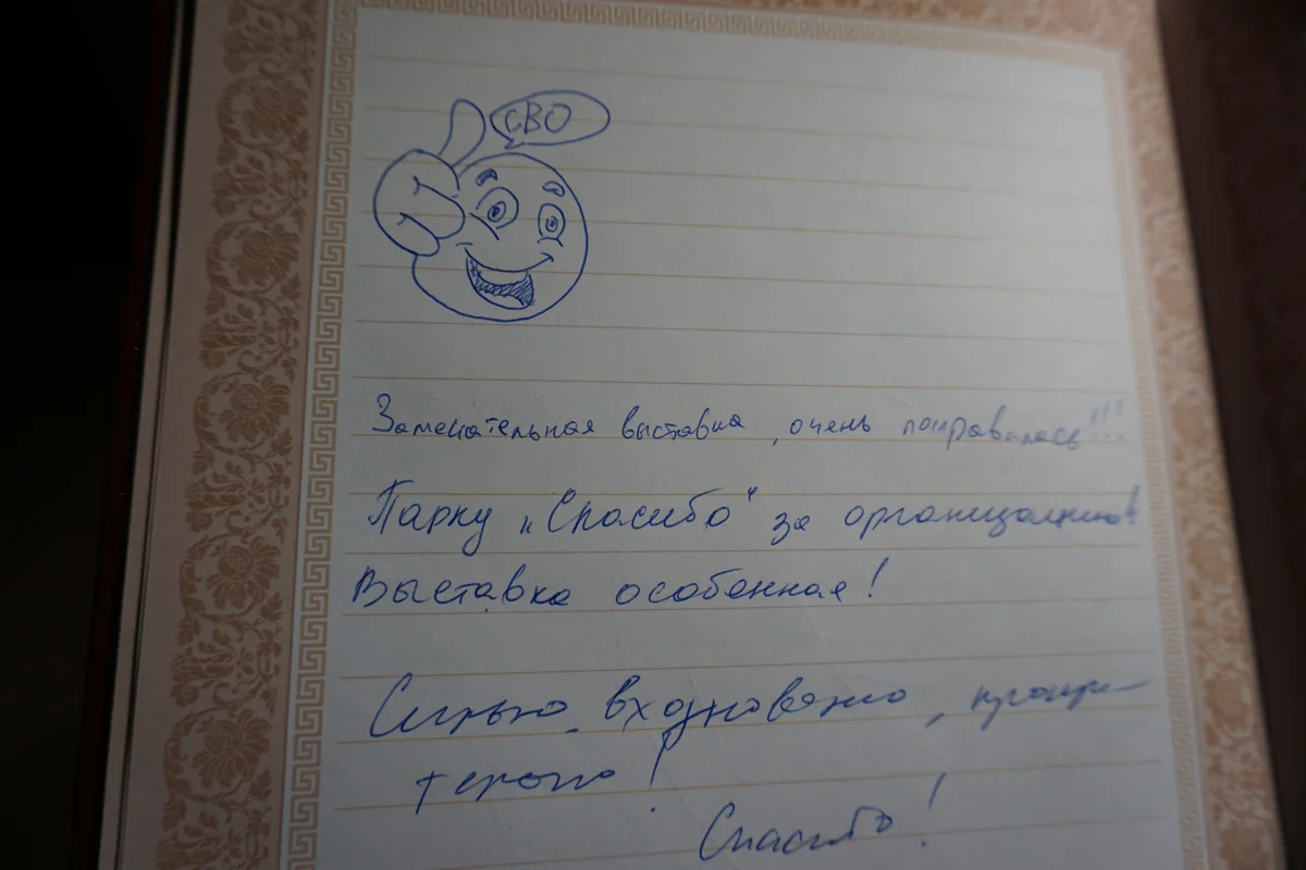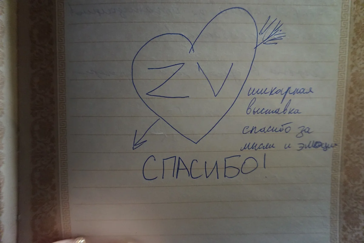 На выходе открываю книгу отзывов. Читаю: «Спасибо за выставку. Эта выставка — одна из немногих, уходя с которой чувствуешь себя наполненным. Победа будет за нами!!! ZOV. Дело Дугиной живет!!!» Дальше: «Шикарная выставка. Спасибо за мысли и эмоции. СПАСИБО!» Рецензия сопровождается рисунком — пронзенным стрелой сердечком с литерами Z и V внутри. В подобном ключе исписана треть книги отзывов. Выделяется одно послание от 10 мая: «Война в голове больных людей и это страшно, не понимаю, что можно здесь посмотреть».