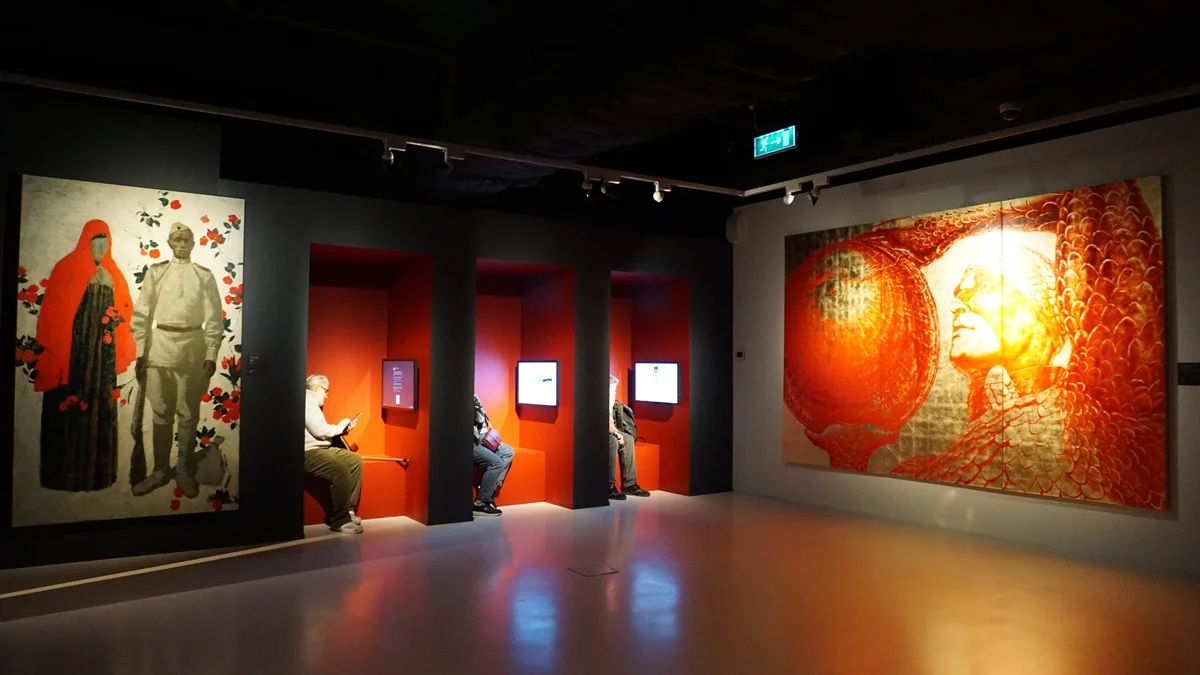 Всё пространство выставки оформлено в насыщенных красном и черном цветах, крошечные лампы приглушены, и экспонаты стоят в зловещем полумраке.