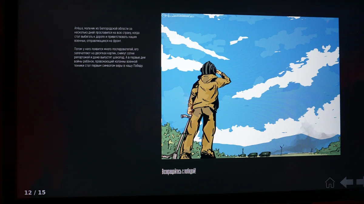 — Эта дыра в экранном холсте — она, не как вы подумали, от вражеского или от нашего же снаряда, а чтобы сквозь нее можно было выйти, не проходя еще раз все экспозиции с конца до начала, — пояснила она.