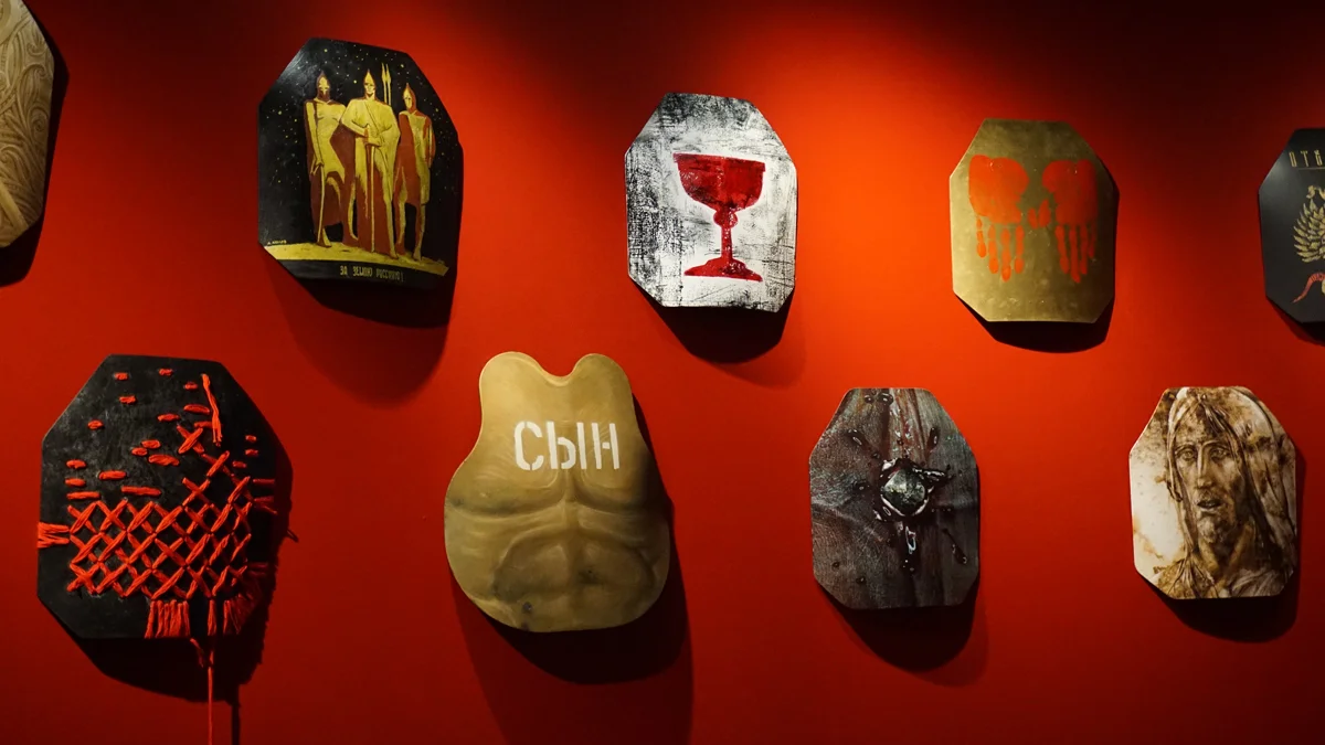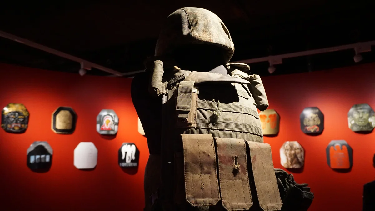 Отсюда, сопровождаемые повторяющимся мрачным гудением, посетители следуют в центр выставки, к экспозиции под названием «Сталь» — развешанным стальным плитам от современных бронежилетов. Пластины бронежилетов разрисованы. Среди них — пластина, имитирующая легендарную игру DOOM с надписью KURSK, где брутальный защитник Отечества с бензопилой поднимает (буквально) «визжащего украинского подсвинка». Вокруг фигуры — разноцветье огня, от солнечно-желтого до багрово-алого, вдалеке торчит кладбищенский крест, а может, и виселица… Осколки от бронежилетов образуют круг, в центре — целиком бронежилет, надетый на манекен, весь в дырках разного калибра, и «расписан» он не под гжель, не под хохлому, и даже не иконами с ликом Спасителя, как другие экспонаты, а каплями запекшейся крови (выглядит как реальная).