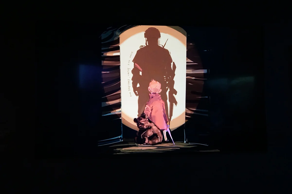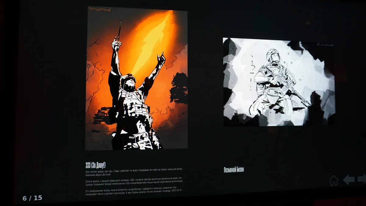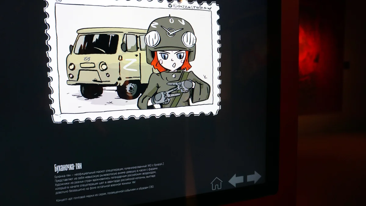 Воспевают убитую Дугину и в цифровом искусстве — в digital art авторства Dazbasta Draw. Оценить его можно, присев в одну из диджитал-будок (тоже красно-черного обрамления), и пролистав комиксы на мониторе — от «333 (За Дашу!)» к «Буханочке-тян», до изображения танка «Алёши» до мальчика Алёши, ставших одними из самых тиражируемых символов «СВО». От этого видеоарта поменьше — вновь к большому, в последний зал.