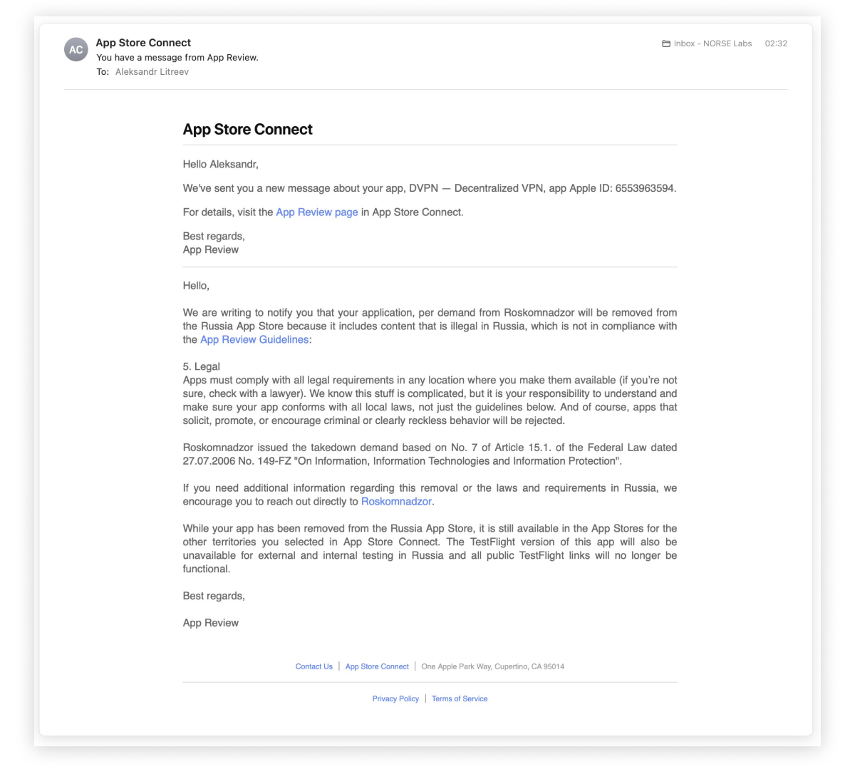 «VPN Гильдия» обнаружила запрос на удаление DVPN из Google Play в Lumen, архиве юридических запросов на удаление онлайн-контента. Автор запроса — Роскомнадзор, дата — 17 апреля. «Мы понимаем, что тема непростая, но это ваша ответственность — убедиться, что приложение соответствует всем местным законам», — говорится в письме Google, поступившем компании. На следующий день, 18 апреля, уже Apple удалила еще один VPN Литреева под названием Sentinel Shield dVPN, который был зарегистрирован на британское юрлицо.
