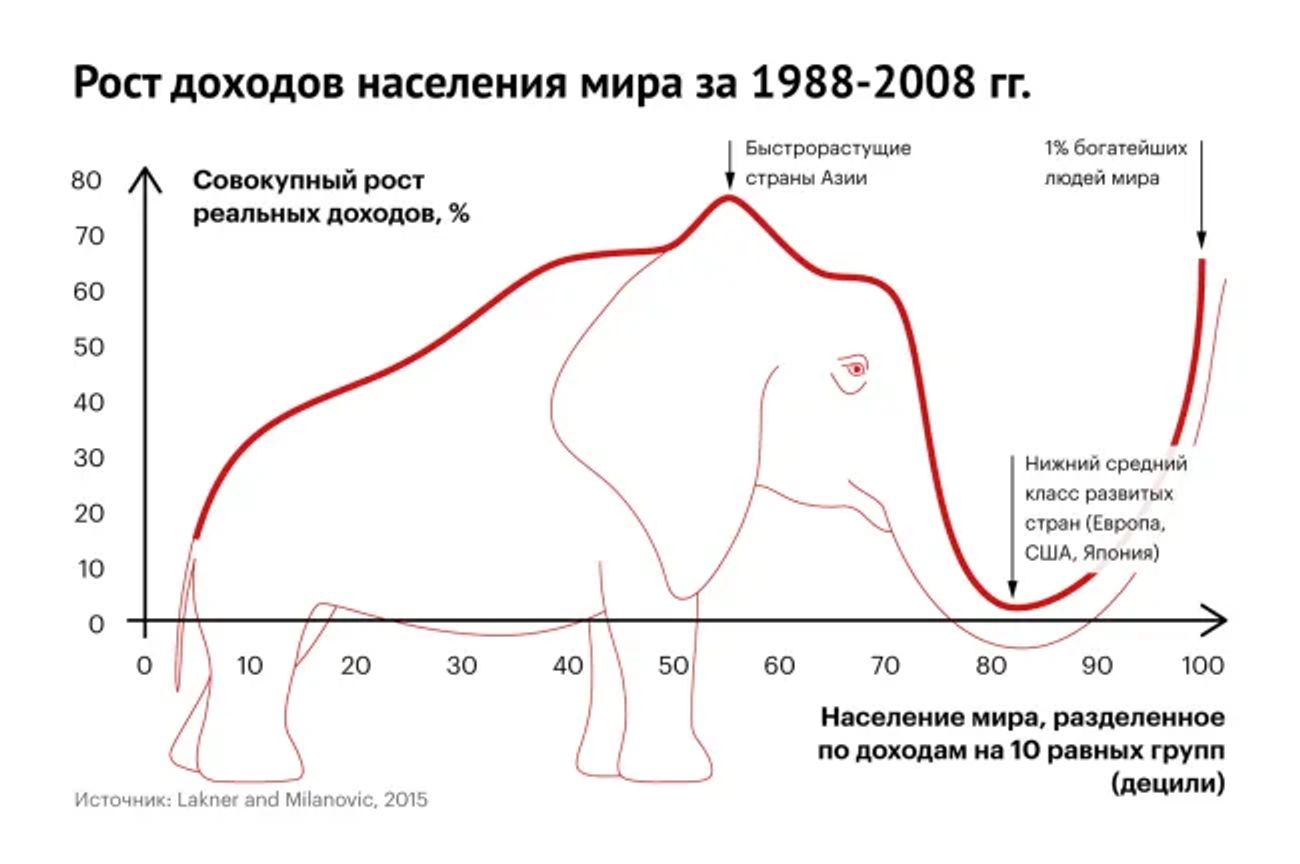 Быстрый рост доходов низкооплачиваемых групп в странах Азии в 1988–2008 годах иллюстрирует «график слона» американского экономиста Бранко Милановича. Рост доходов в левой части этого графика — это рабочие, которые стали получать более высокую заработную плату в ходе переноса производств из США и Европы в развивающиеся страны, прежде всего в Азии.