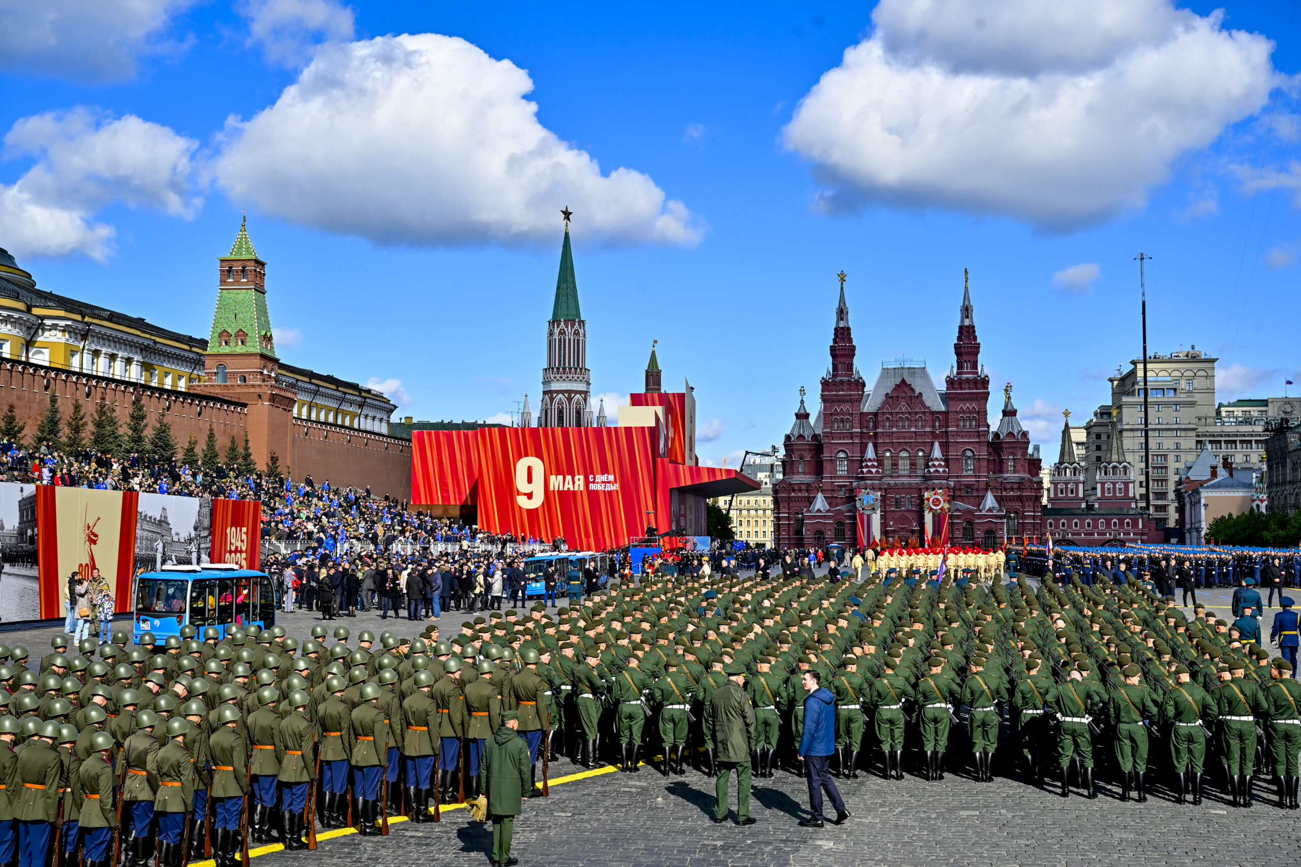 Фото: Войска маршируют во время парада Победы, проводимого в рамках празднования 80-летия Победы в Великой Отечественной войне на Красной площади в Москве. Sefa Karacan / Anadolu via Reuters