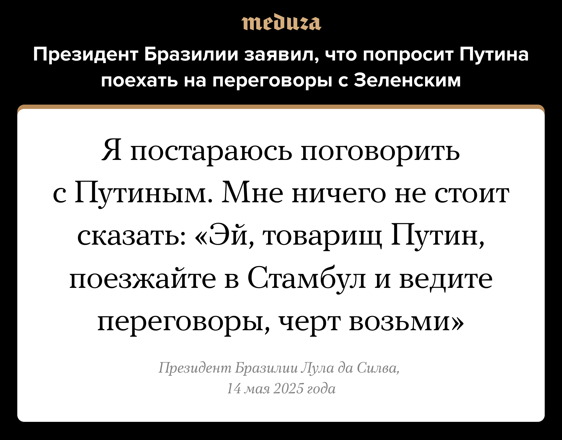 Ранее президент Бразилии Лула да Силва заявлял, что «поговорит» с Путиным и призовет того принять участие в переговорах в Турции. «Мне ничего не стоит сказать: „Эй, товарищ Путин, поезжайте в Стамбул и ведите переговоры, черт возьми“», — сказал он.
