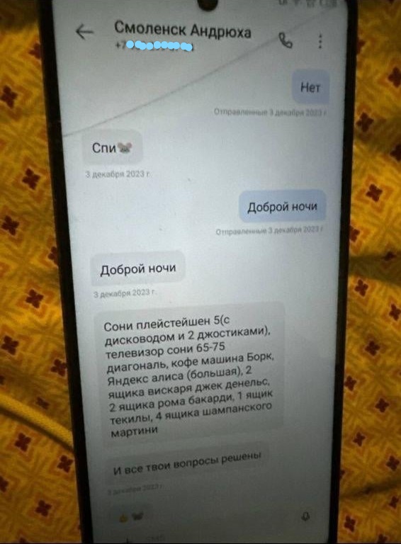 "Сони плейстейшн 5 с дисководом и 2 джостиками (здесь и далее орфография сохранена. – СР), телевизор Сони 65-75 диагональ, кофе машина Борк, яндекс Алиса (большая), 2 ящика вискаря джек денельс, 2 ящика рома бакарди, 1 ящик текилы, 4 ящика шампанского. И все твои вопросы решены", – написал Андрей Марченков своему подчиненному Илье Коротуну в декабре 2023 года.
