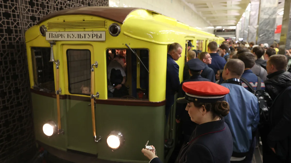 Ретро-поезд на станции метро «Сокольники» во время празднования 90-летия Московского метрополитена, 15 мая 2025 года. Фото: Максим Шипенков / EPA