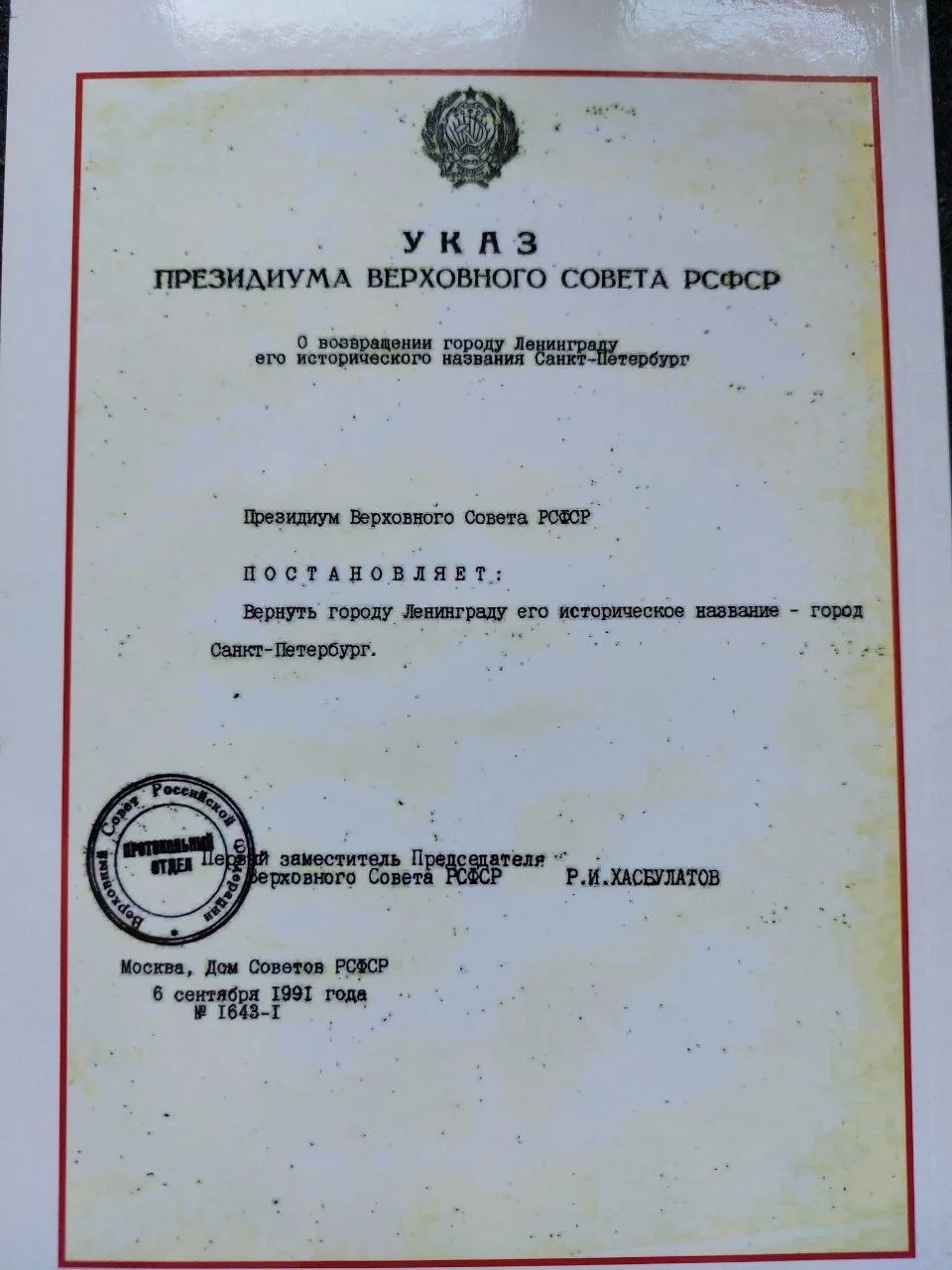 6 сентября 1991 года президиум решил: руководствуясь мнением жителей Ленинграда, вернуть городу его историческое название Санкт-Петербург. 7 сентября решение было опубликовано и вступило в силу.