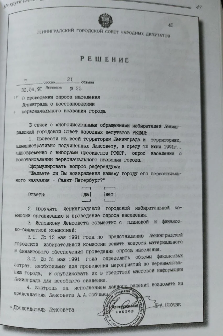 Процесс, что называется, пошел. И в нем участвует, в том числе, и председатель Ленсовета Анатолий Собчак, но он не поддерживает возвращение городу исторического имени, а совсем наоборот. Сначала он говорит, что это недопустимо, поскольку это оскорбляет память блокадников и фронтовиков — защитников Ленинграда, потом — что это требует огромных расходов на изготовление новых вывесок, штампов, печатей, официальных бланков, справочников…