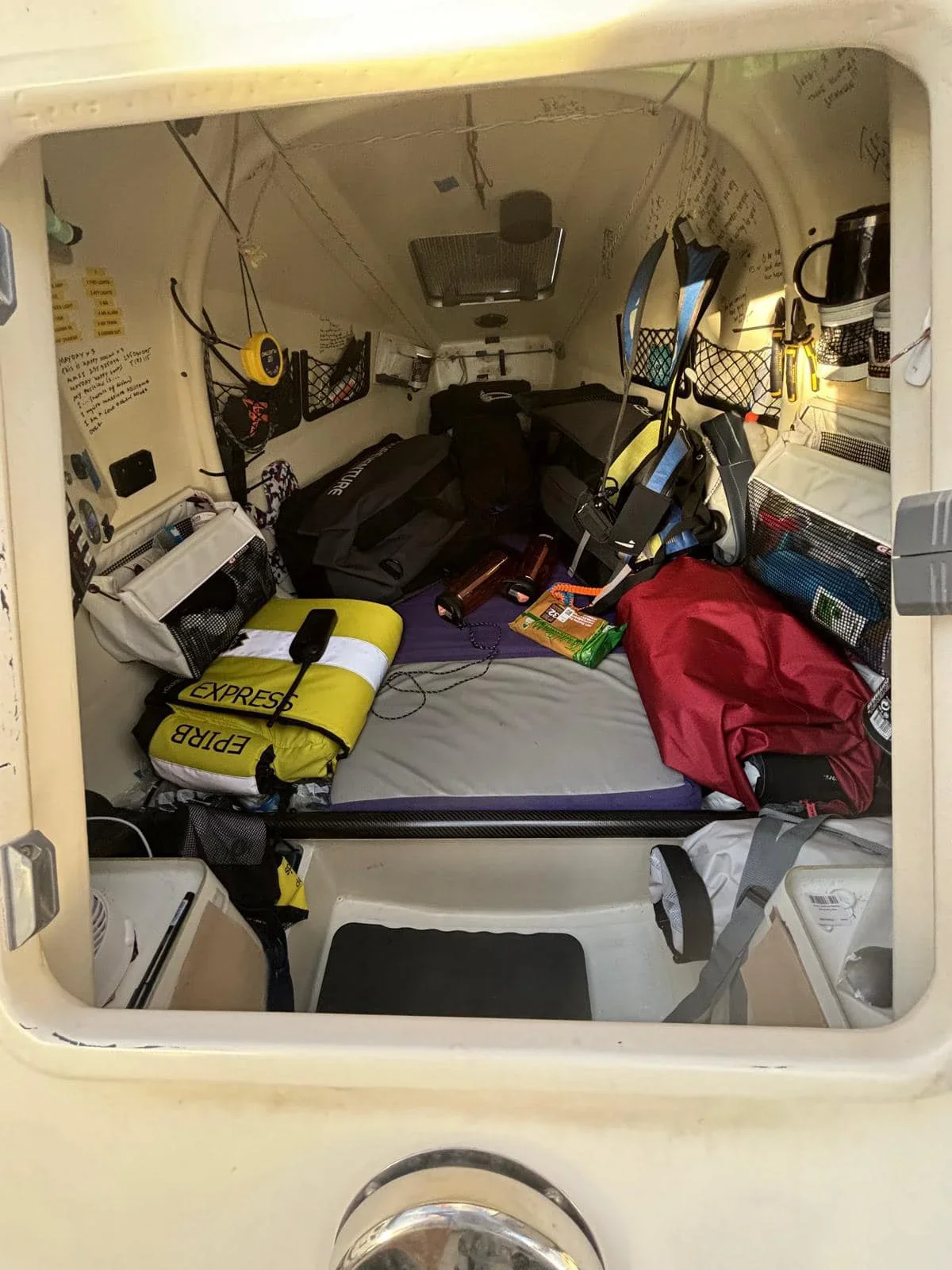 One time my cabin flooded. I had a lot of snacks under my mattress, which all got wet and went bad. For the last two weeks, I had no snacks at all, and I was seriously lacking in energy. I started hallucinating. My GPS was showing completely different numbers, as if I was going backwards. I was seeing ships, like a ship suddenly appearing on the waves, in detail. Not like some phantom ship. Real ones, just not where they should be. On the whole, I was in pretty critical condition for the last three weeks. It was just totally bleak. Picture the scene. I’m very weak, in a severe storm and 40-degree heat, and I spent a week at anchor. At times like those, I got scared. Not that I’d die. I just thought I’d become an ocean monster that would be stuck there forever and that the ocean wouldn’t let me go, that I was just another sea creature now.