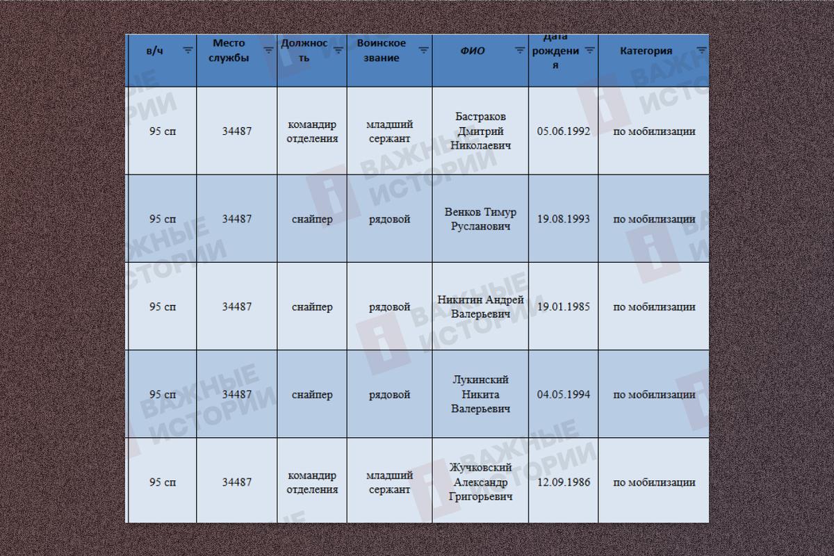 Статус «двухсотых» (убитых) в базе имеют 235 человек, гибель некоторых из них можно подтвердить по публичным некрологам. При этом в данных встречаются россияне, о смерти которых не сообщалось ранее в СМИ. Например, напротив имени Николая Дмитриева из поселка Кневицы стоит пометка «не прибыл из отпуска», а рядом — «03.12.2023г сгорел в машине Инфо от Соколова А.Р.08.12.2023» (пунктуация сохранена). Данные реестра наследственных дел подтверждают, что Дмитриев умер 3 декабря 2023 года. В этот день в местных новостях писали о двух сгоревших автомобилях, в одном из которых погиб человек. Жительница Кневиц уточнила в комментариях, что «погиб молодой парень», который «только пришел с СВО».