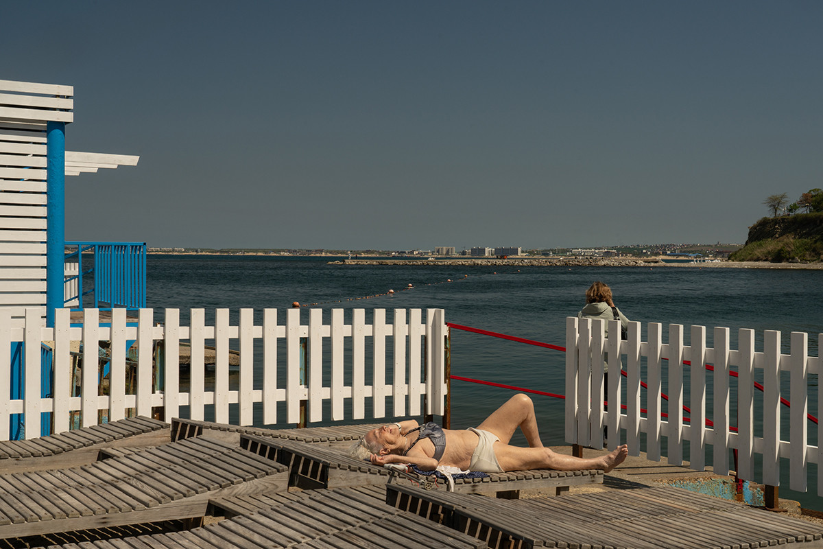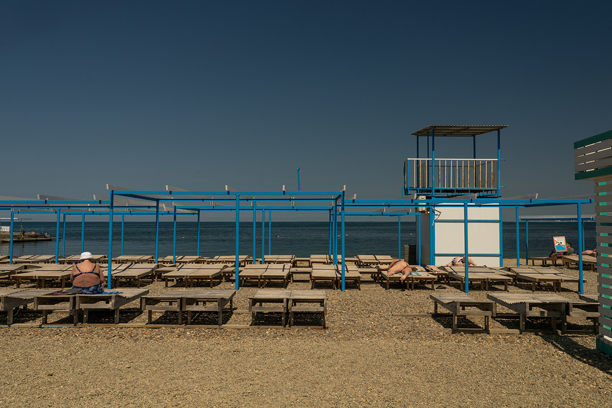 Один из спасателей говорит: «Работы заканчиваем, скоро сезон будем открывать». Другой признается, что и сам купался в море — в защитных костюмах жарко, солнце припекает, а работа физически тяжелая. За их спинами ездит экскаватор, равняющий гальку перед шезлонгами с загорающими.