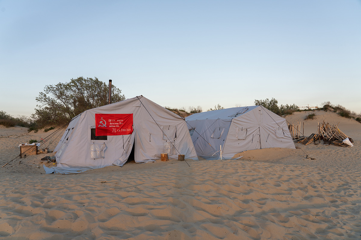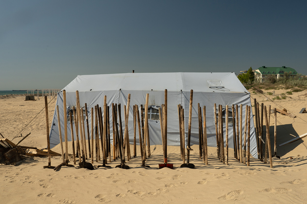 Спустя пять месяцев на анапском побережье почти не осталось волонтеров. Теперь здесь трудятся спасатели и бюджетники из разных районов Краснодарского края. Песчаное побережье в 54 км поделили между 41 районом, у каждого — своя палатка и флаг. Границы убираемой территории размечены колышками.