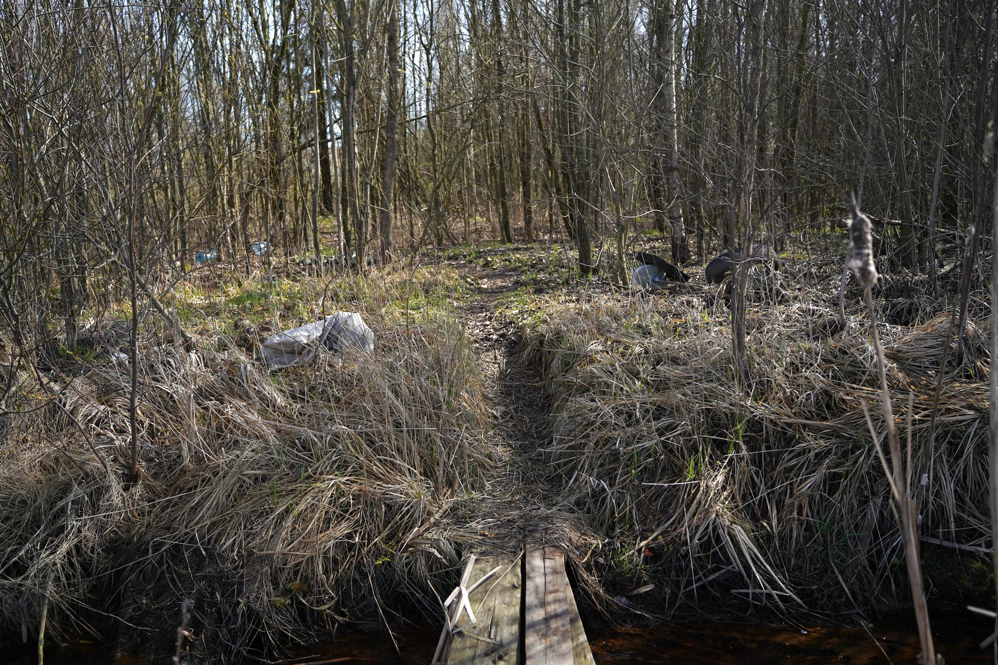 Пробраться к поселению старожилов свалки можно только малоизвестными тропами. Вокруг — болото. Единственный проход — мостик через неглубокий ручей, протекающий вдоль трассы. От его запаха чешутся глаза. Приходится задерживать дыхание. Вода — коричневая, медного оттенка. Такой цвет появился то ли из-за текущего со свалки фильтрата (он образуется при гниении мусора), то ли из-за сбросов станции очистных сооружений неподалеку.