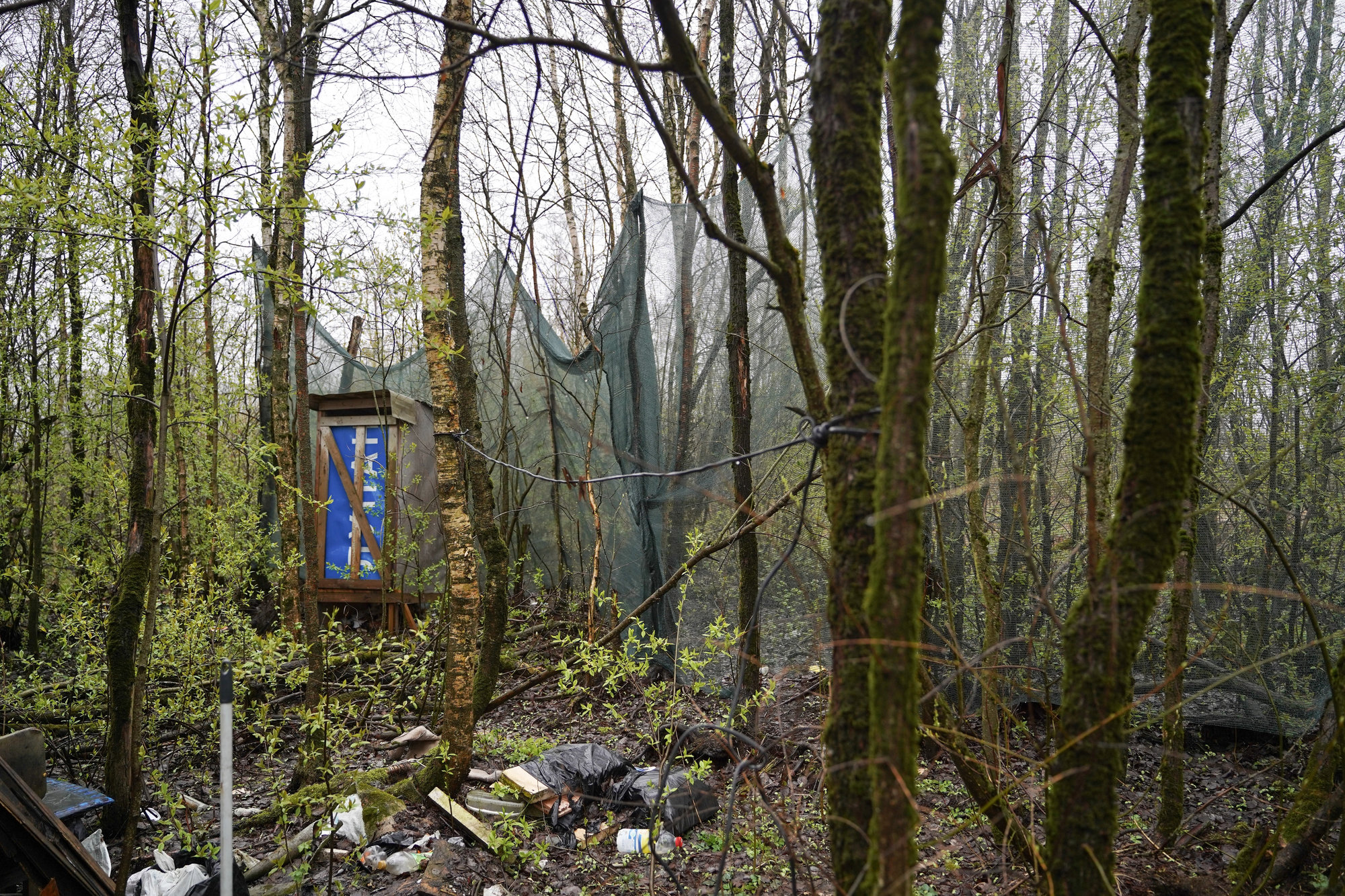На входе в лес валяются спиленные деревья, упаковки из-под снеков, старые фотоаппараты, лопаты, виднеются чьи-то свежие следы. Первый домик на пути — дощатый, с зеркальцем на фасаде. Но там, по словам Василия, постоянно уже никто не живет.