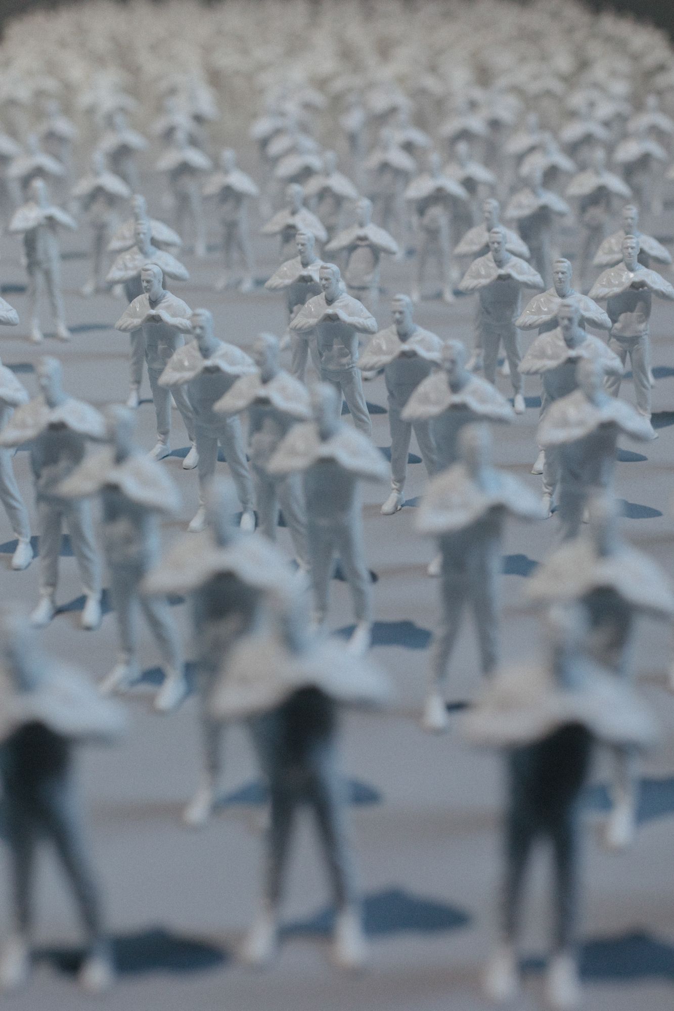 Как бы то ни было, от ассоциации с недорогими пластиковыми игрушками все равно никуда не деться, к тому же статуэтки одинаковые, тиражные. Это мог бы быть проект о коммерциализации протеста, если бы не один принципиальный момент: Санчес Кастильо раздает фигурки бесплатно. Как минимум поэтому его инсталляция напоминает не прилавок «Детского мира», а политическую акцию (а расставленные на подиуме в хаотичном порядке фигурки героя — снятый с коптера массовый митинг).