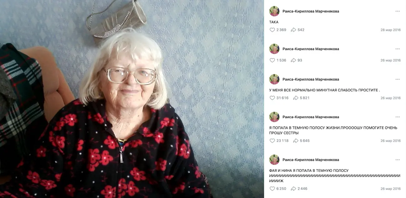 Это самый популярный и растиражированный пост Раисы Кирилловой-Марченяковой. Сейчас у него более 18 тысяч лайков и почти 6,5 тысячи репостов: за то время, что я писал этот текст, их количество выросло на пару сотен. Раз в год или около того я натыкаюсь на скриншот этого поста в твиттере или телеграме, и каждый раз подписи к нему говорят о том, что люди его, как принято говорить в интернете, максимально чувствуют: «i feel you», «настроение Раиса Марченякова», «мой главный страх» и так далее. Часто из этих фраз следует, что их авторы много думают о написанном Раисой Павловной и боятся когда-нибудь оказаться в такой же ситуации, как и она. Но чаще всего они просто жалеют пожилую женщину и сочувствуют ей: «Раиса Кириллова-Марченякова… как бы я хотел просто обнять её и развеселить».