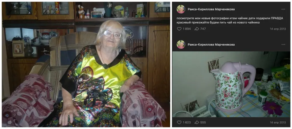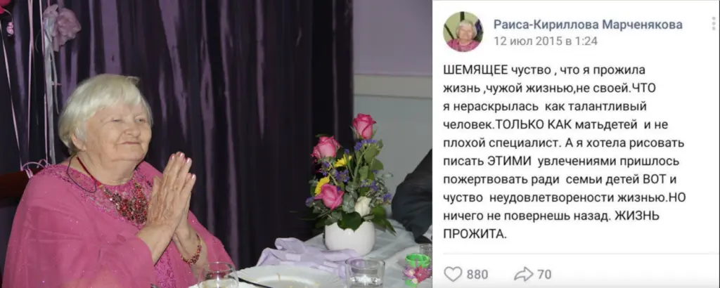 В общем, пост Раисы Павловны моментально вгоняет людей в печальные думы о смысле жизни. И дело не столько в его содержании — в конце концов, в интернете жалобами на несложившуюся жизнь никого не удивишь, — сколько в том, что написал его очень пожилой человек. Это добавляет истории колорита и драматизма: на момент публикации поста Раисе Кирилловой-Марченяковой было 80 лет. Во-первых, даже сейчас настолько возрастные блогеры встречаются редко, а тогда, в 2015 году, количество популярных страниц, авторы которых — люди глубокого пенсионного возраста, можно было пересчитать по пальцам. Во-вторых, такой пост 80-летней женщины — это всё-таки не то же самое, что нытьё твиттерского миллениала, и фраза «Жизнь прожита» в этом контексте кажется максимально серьёзной и весомой.