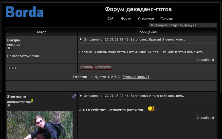 . Тот же адрес был указан на сайте о петербургских готах. Администратор сайта называл себя Shermann и представлялся журналистом одной из петербургских редакций. Но раз за разом ссылался на статьи Гущина и его лекции