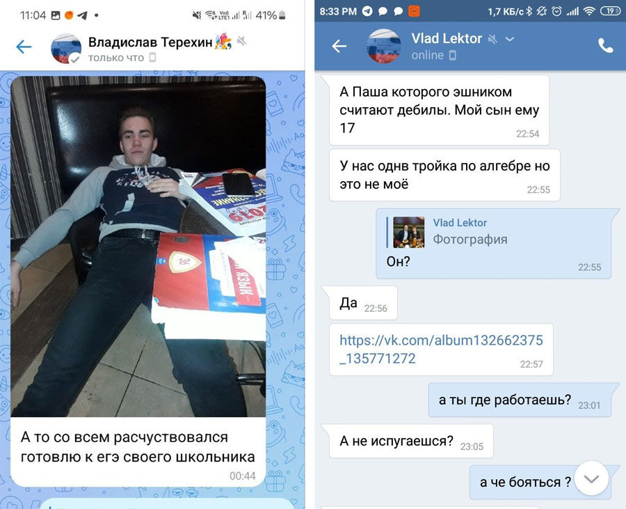 Петр Иванов, журналист Увиделся я с ним на митинге в 2018 году, ко мне подошел Влад Лектор (прозвище, под которым теперь известен Терехин), начал разговаривать. Потом он вдруг пишет, скидывает фотографии — он видимо за мной пошел последил и сфотографировал. Мне тогда было 15 или 16. Я был в 9 классе. Он мне писал, давай пива попьем, я говорю, мне 18 нет, он говорит, какая разница, я тебе куплю. Пишет, ты где учишься? В школе. Давай я тебя к ЕГЭ подготовлю. И скидывает фотографии с каким-то типом, якобы то ли его друг, то ли сын, они там к ЕГЭ готовятся.