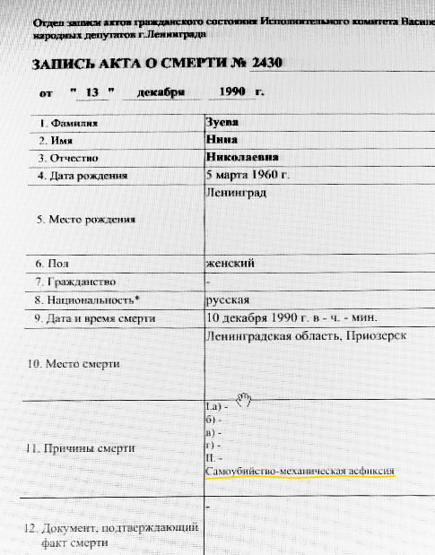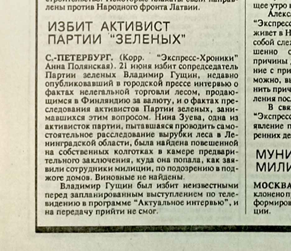 Одним из тех, кто разыскивал Зуеву по лесам, пока ее тело висело в петле в камере, был молодой ленинградец, один из создателей Партии зеленых Владимир Гущин. Год спустя, писали тогда в газетах, покушение было совершено и на него самого.