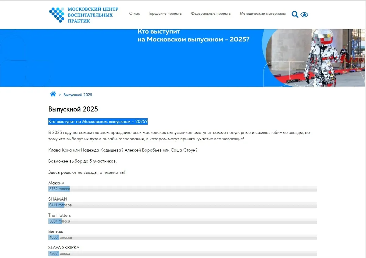 Как это работает: в чат класса присылается ссылка на голосование, чтобы школьники могли сами выбрать, кто выступит на их празднике. Отличная инициатива, но есть нюанс: ссылка ведет нас на сайт Московского центра образовательных практик. Как гласит сайт, организация создана «для координации воспитательной деятельности в школах и колледжах столицы», призвана «формировать траекторию счастливого детства для каждого юного москвича» и, конечно же, воспитывать в нем традиционные ценности. Один из главных разделов сайта посвящен «Разговорам о важном» — здесь можно найти все методические материалы, скачать видео, презентации и даже плакаты. Также этот центр организует для школьников встречи с различными лояльными к власти звездами вроде Александра Маршала и Карена Шахназарова. Но вернемся к опросу.