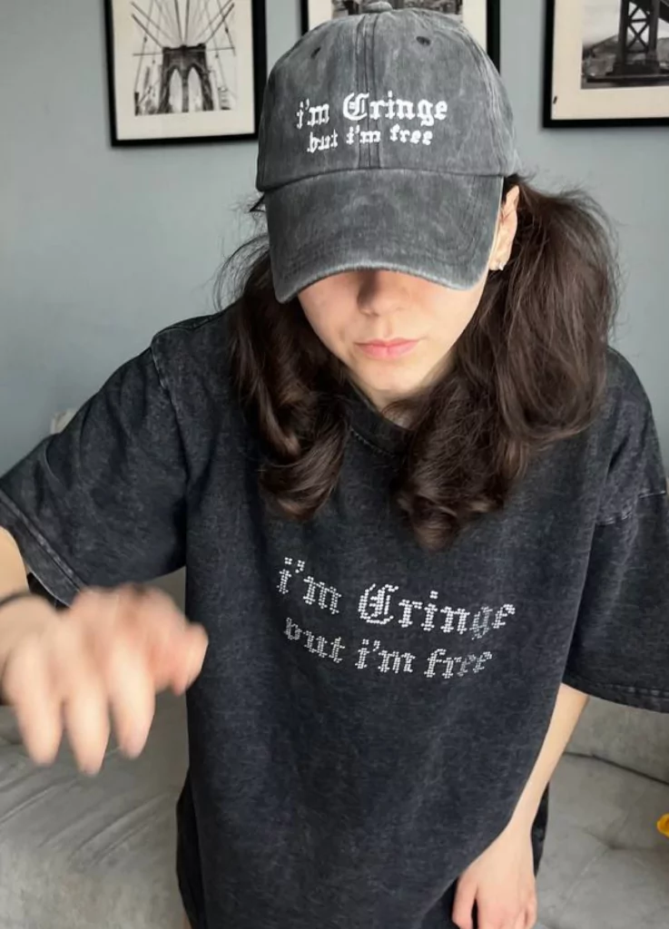 Я увидела мем, где котенок прыгает через радугу с надписью i am cringe but i am free («я кринжовая, но я свободная»), и решила попробовать сделать футболку с такой надписью. Тогда же я поняла, что целевая аудитория бренда — зумеры, потому что я сама на приколе и мне сложно работать с серьезными дядьками.