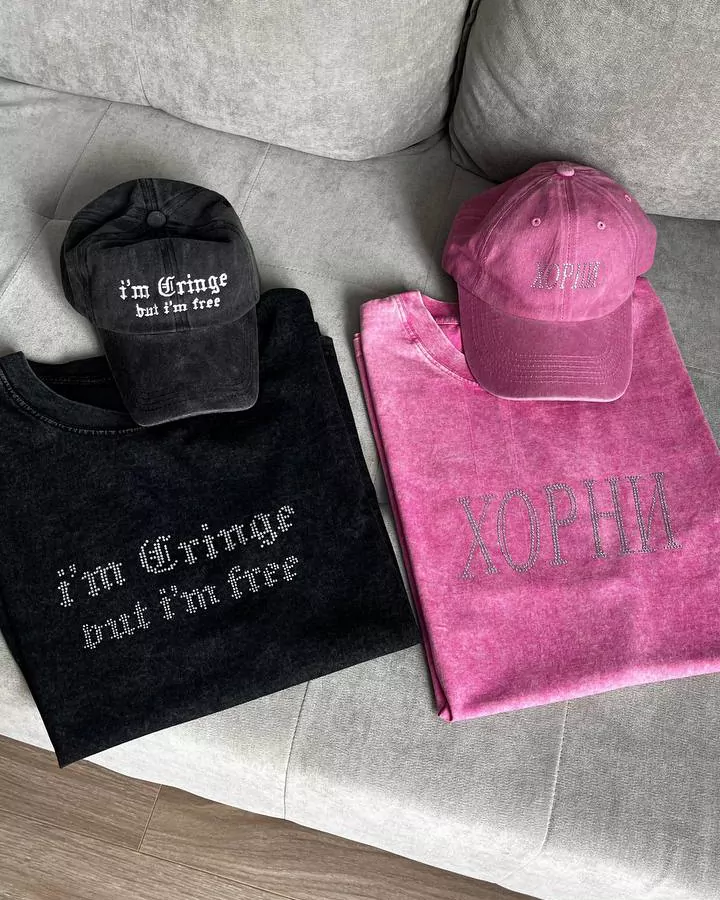 Тогда же я рисовала разные дизайны и решила сделать тестовые образцы — заказала на «Вайлдбериз» готовые футболки и кепки и нашла производство, которое наклеивало на них надписи. По итогу у меня было пять кепок и столько же футболок с разными надписями. В апреле я начала снимать рилсы с ними — смотреть, что нравится аудитории, что оставлять, а что убрать. Параллельно искала варианты начать массовое производство.