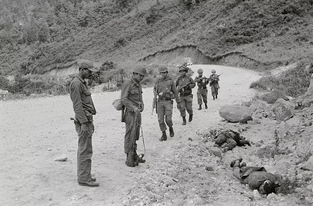 Гондурасские военные осматривают тела убитых сальвадорских солдат, ставших жертвами перестрелки 18 июля 1969 года. Фото: Bettmann / Getty Images