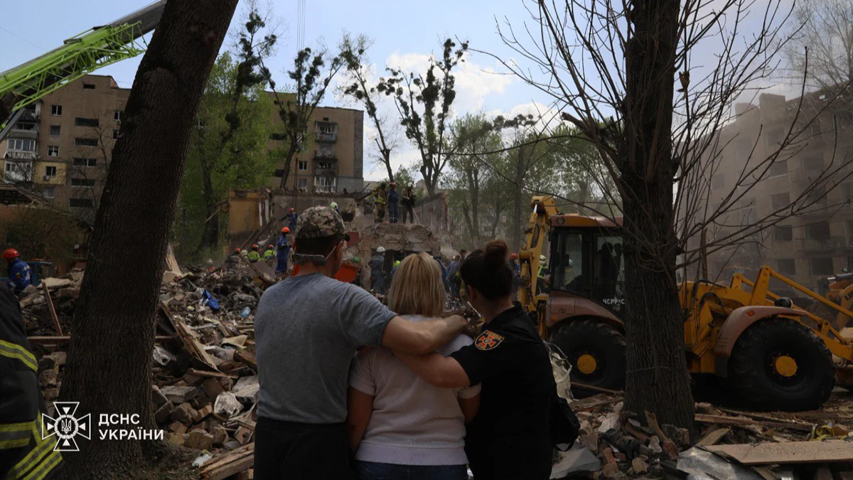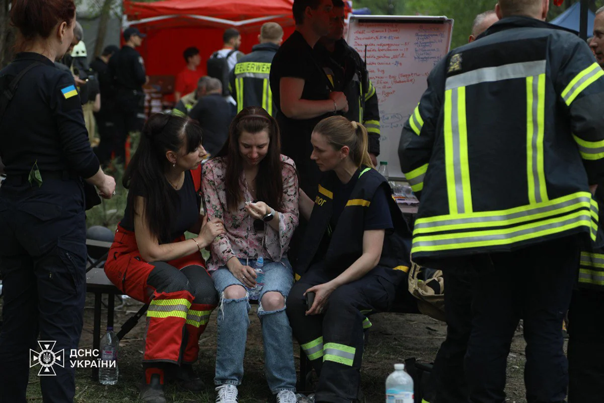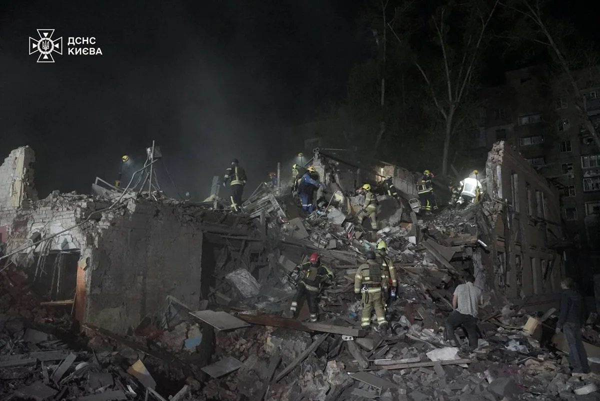 Жители и службы немедленного реагирования у завалов дома после массированного обстрела Киева, Украина, 24 мая 2025 года. Фото: ДСНС Украины