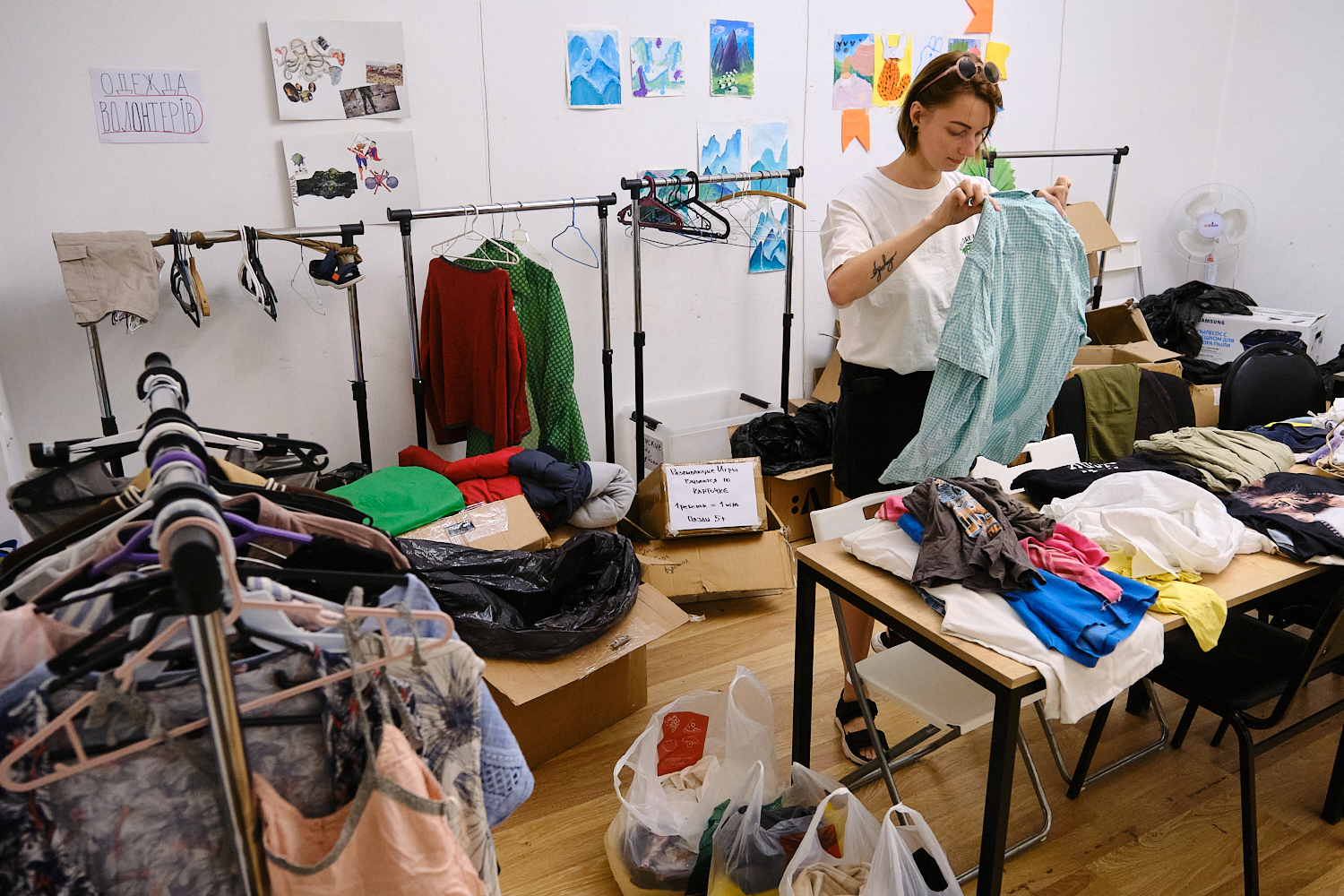 Новые порции вещей в комнату приносит Инна. Она разбирает оставшиеся коробки с летней одеждой. Инна из Киевской области и говорит, что в последний год ее жизнь полностью связана с пунктом помощи. В 2022-м девушка впервые пришла в Choose to Help как посетительница, потому что осталась без работы.