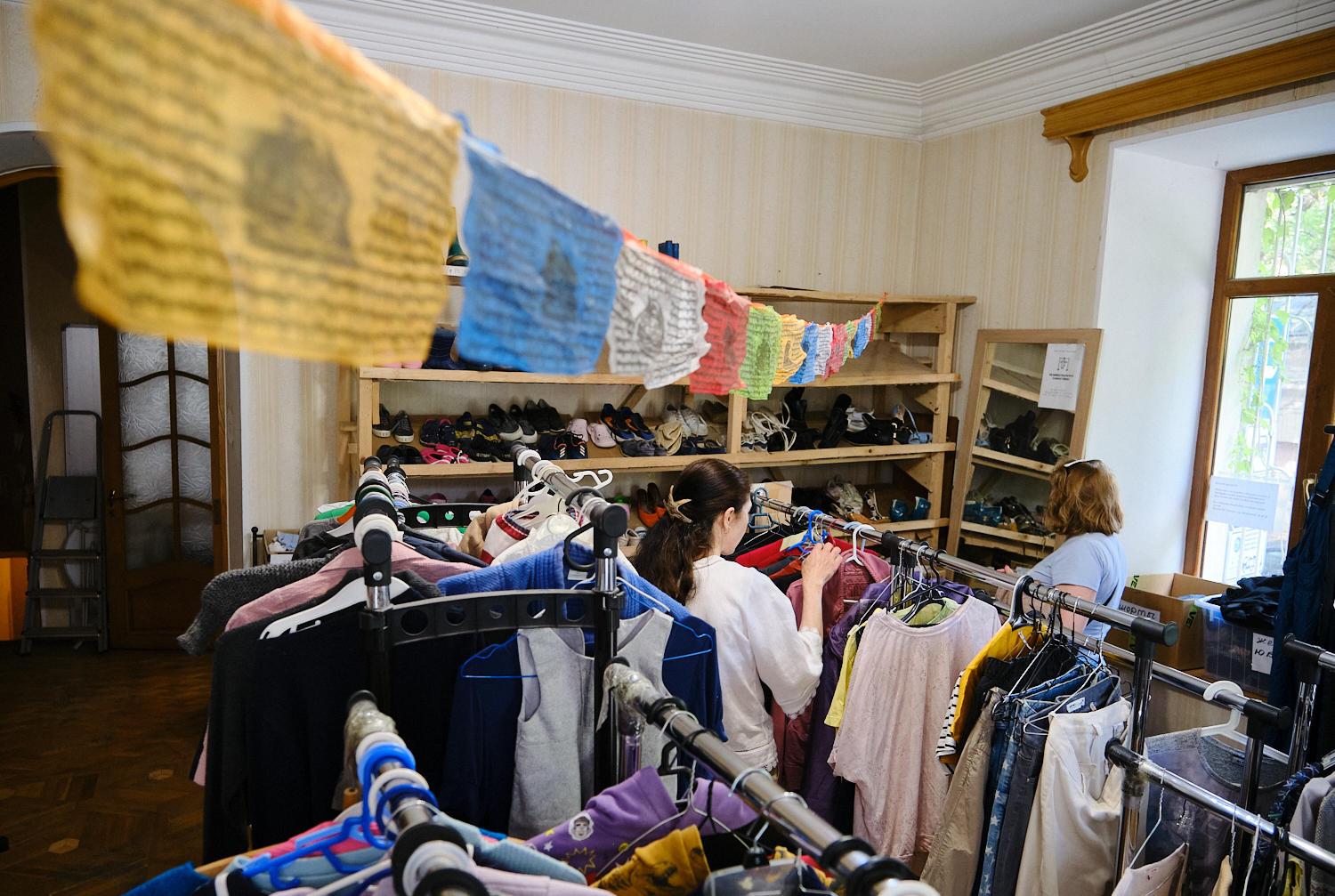 В комнате с одеждой женщины рассматривают вещи на вешалках. Тут несколько рейлов с платьями, футболками, рубашками. На полках — обувь, в коробках — нижнее белье. Сейчас здесь можно выбрать летние вещи из запасов Choose to Help. Алина говорит, что комната с одеждой — самая популярная, тут посетители примеряют вещи, общаются, шутят. По ее словам, всё, что сейчас находится в комнате, скорее всего, разберут до конца дня.